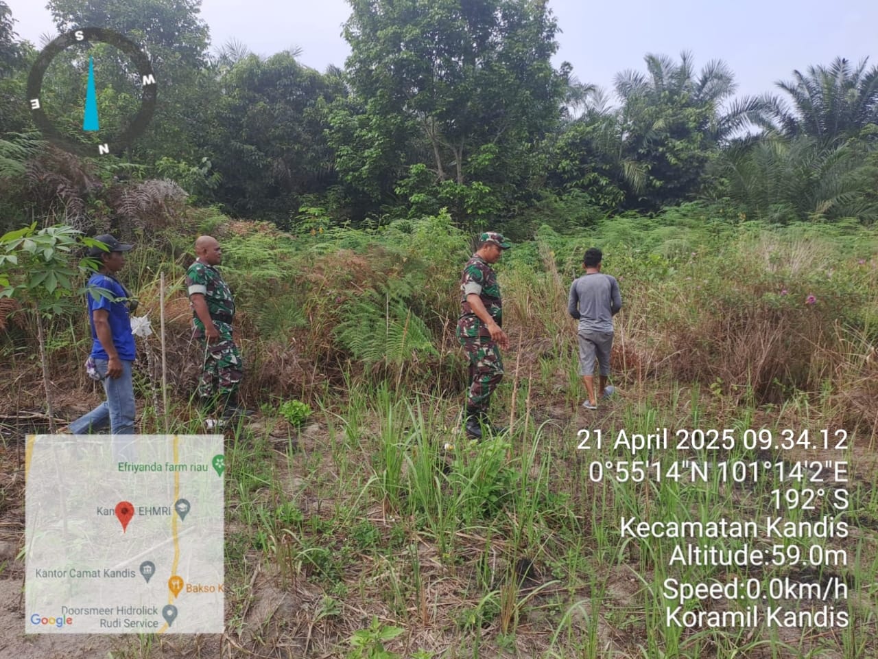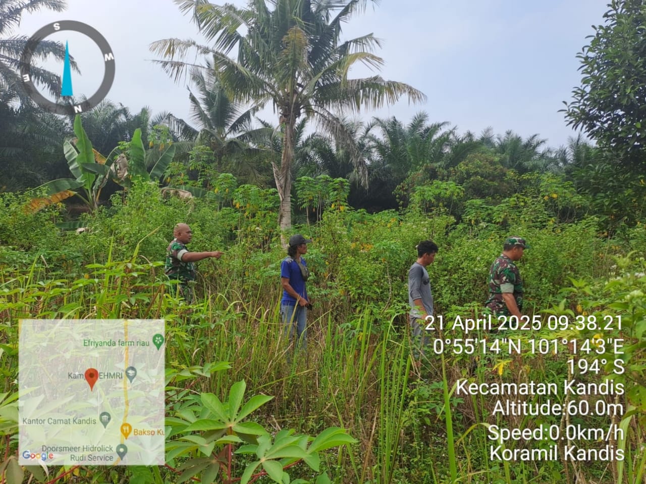 KANDIS – MATAHUKUM.ID – Babinsa Koramil 05/Pwk Kandi yaitu Sertu Bosur Siregar dan Serda Satria M bersama dua orang warga tempatan melaksanakan kegiatan rutin yaitu berpatroli karhutlah diarea lahan rawan terbakar hari ini di wilayah Kampung Libo Jaya Kecamatan Kandis Kabupaten Siak, Riau. Senin, 21 April 2025.