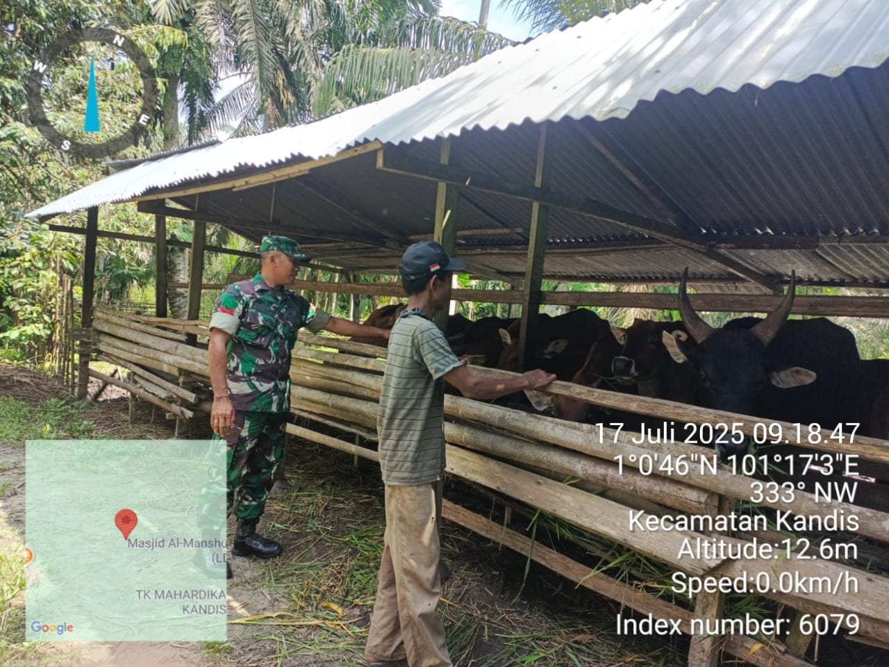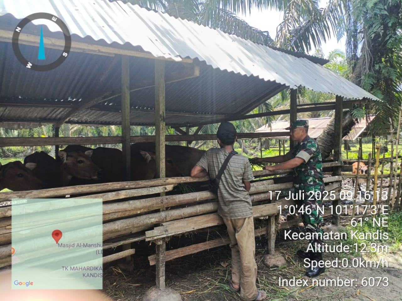 KANDIS – MATAHUKUM.ID – Babinsa Koramil 05/Pwk Kandis, Kodim 0322/Siak, Koptu I Ketut B hari ini melaksanakan pendampingan Vaksinasi Penyakit Mulut dan Kuku (PMK) hewan sapi ternak di Kampung Kandis Kecamatan Kandis Kabupaten Siak, Riau. Kamis, 17 Juli 2025.