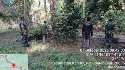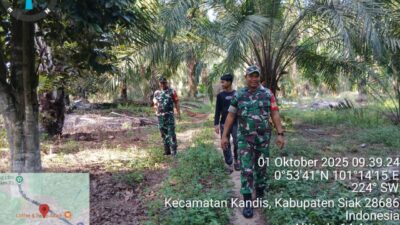 KANDIS – MATAHUKUM.ID – Babinsa Koramil 05/Pwk Kandis, Sertu Bosur Siregar dan Sertu Abdul Arfan bersama warga tempatan melaksanakan kegiatan Patroli Kebakaran Hutan dan Lahan di sejumlah perkebunan serta lahan masyarakat yang dianggap rawan kebakaran diwilayah Kampung Libo Jaya Kecamatan Kandis Kabupaten Siak, Riau. Rabu, 1 Oktober 2025.
