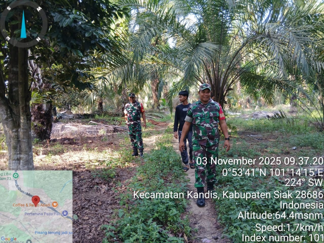KANDIS – MATAHUKUM.ID – Babinsa Koramil 05/Pwk Kandis yaitu Sertu Abdul Arfan dan Sertu Bosur Siregar melaksanakan kegiatan patroli karhutla di wilayah Kampung Libo Jaya Kecamatan Kandis Kabupaten Siak, Riau. Senin, 3 November 2025.