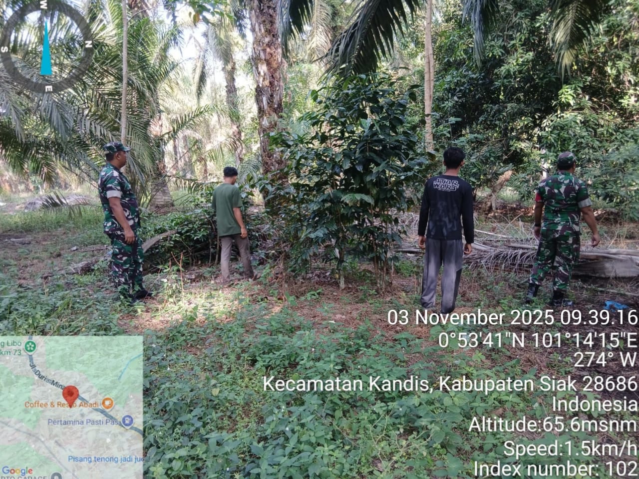 “Saat ini kami yang terdiri dari dua orang Babinsa bersama dua warga melaksanakan kegiatan patroli karhutla tepatnya di wilayah Kampung Libo Jaya Kecamatan Kandis Kabupaten Siak.