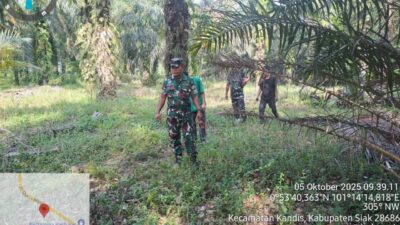 KANDIS – MATAHUKUM.ID – Babinsa Koramil 05/Pwk Kandis, Sertu Andi Satria dan Sertu Edy Simanjuntak bersama warga tempatan melaksanakan kegiatan Patroli Kebakaran Hutan dan Lahan di sejumlah perkebunan serta lahan masyarakat yang dianggap rawan kebakaran diwilayah Kampung Sam Sam Kecamatan Kandis Kabupaten Siak, Riau. Minggu, 5 Oktober 2025.