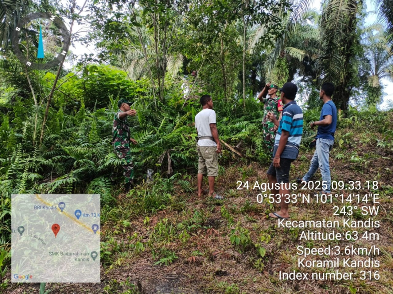 KANDIS – MATAHUKUM.ID – Babinsa Koramil 05/Pwk Kandis, Peltu Yus Armin dan Koptu I Ketut Budiasa bersama warga tempatan melaksanakan kegiatan Patroli Kebakaran Hutan dan Lahan di sejumlah perkebunan serta lahan masyarakat yang dianggap rawan kebakaran diwilayah Kampung Kandis Kecamatan Kandis Kabupaten Siak, Riau. Minggu, 24 Agustus 2025.