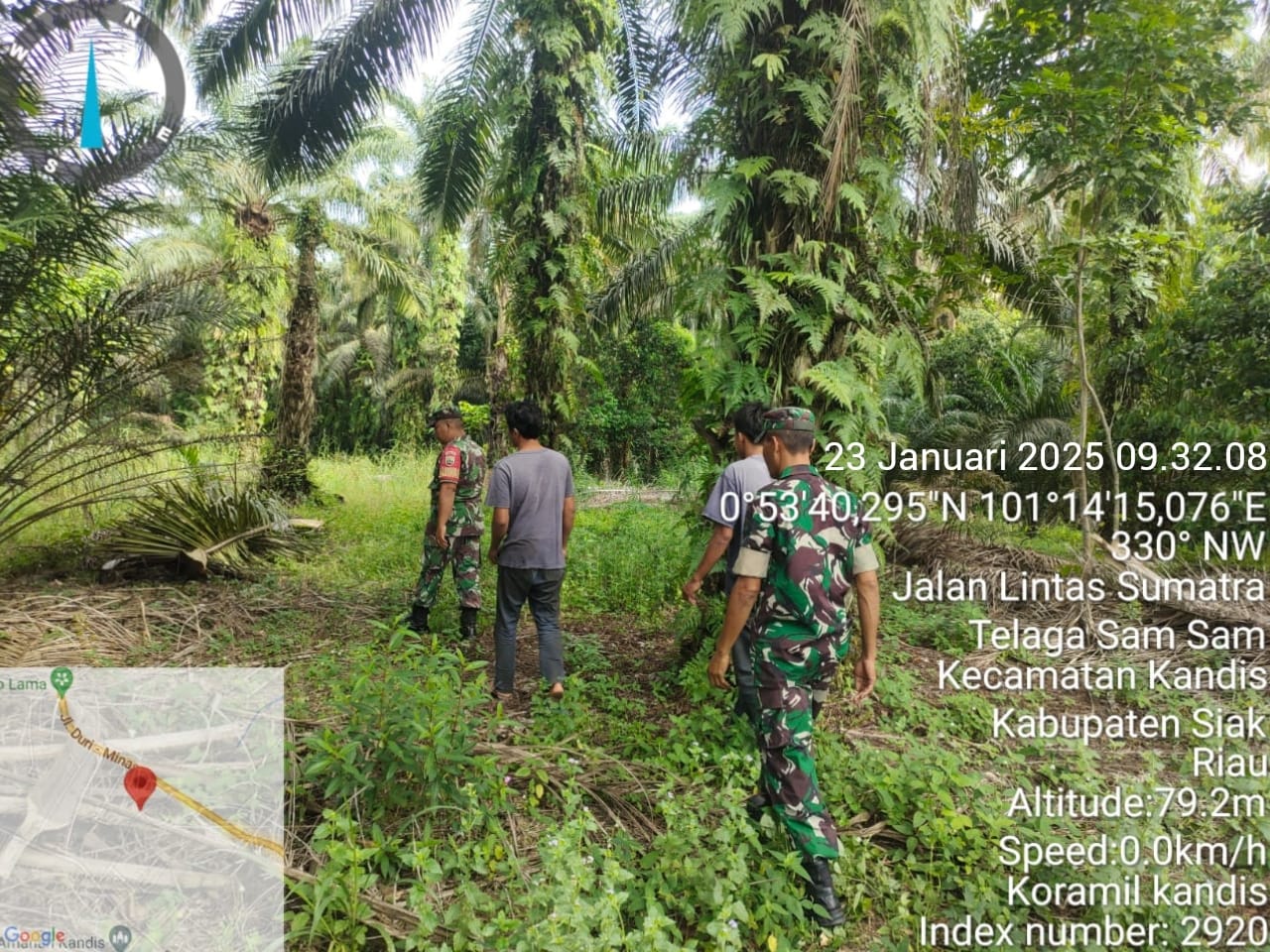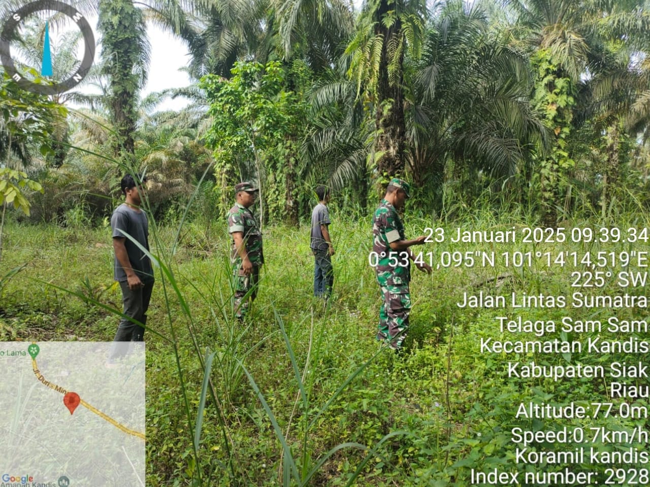 Kandis – matahukum.id – Babinsa Koramil 05/Pwk Kandis, Sertu Sutikno dan Serda D. Gultom bersama dua orang warga tempatan melaksanakan kegiatan patroli Kebakaran Hutan dan Lahan di sejumlah perkebunan serta lahan masyarakat yang dianggap rawan terbakar hari ini diwilayah Kampung Sam Sam Kecamatan Kandis Kabupaten Siak, Riau. Kamis, 23 Januari 2025.