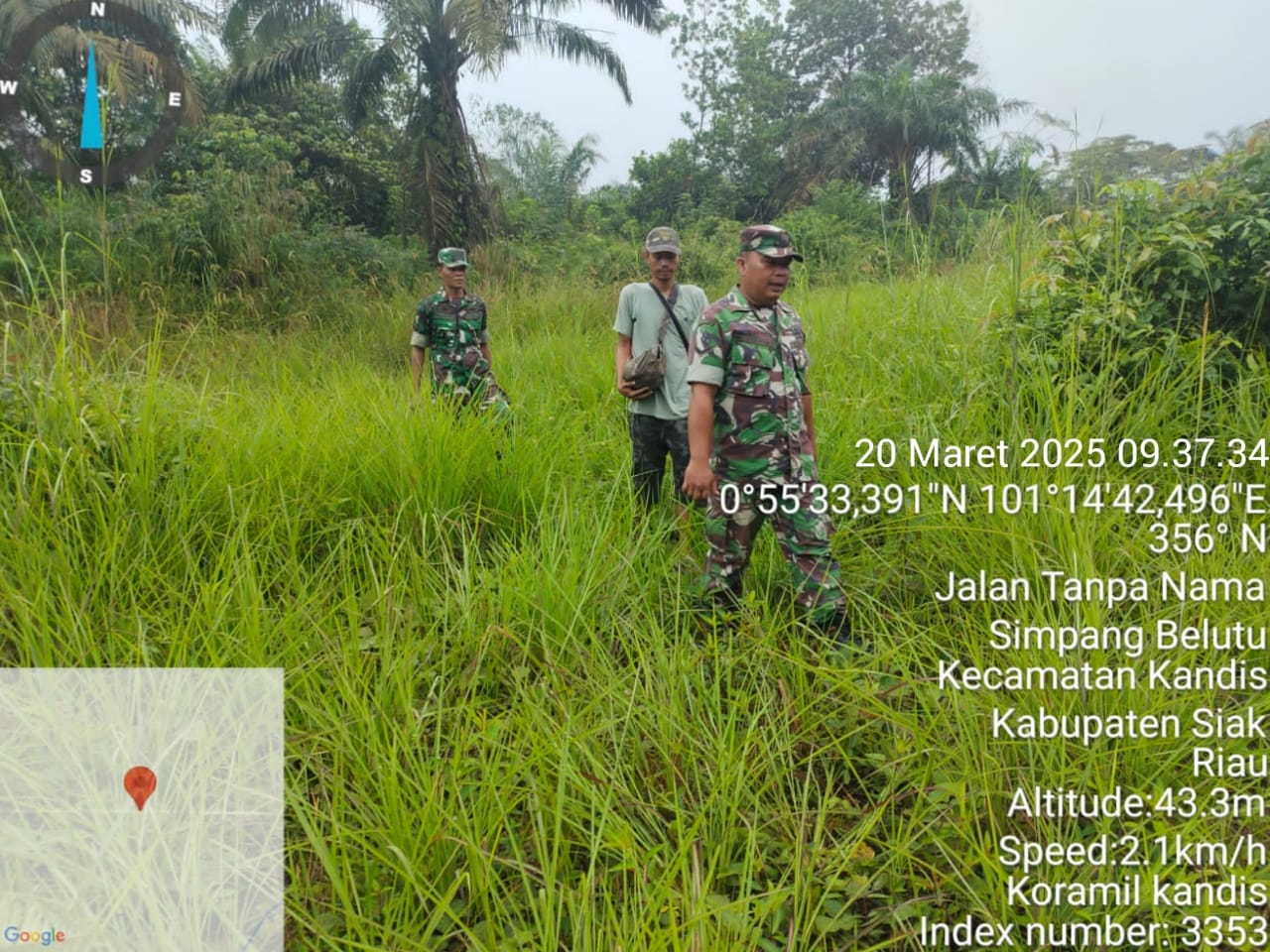 Babinsa Sertu Aprianto bersama rekannya Serda D. Gultom menyatakan, ” Bahwa hari ini disaat pihaknya bersama dua orang warga tempatan melaksanakan patroli karhutlah diarea lahan rawan terbakar wilayah Kelurahan Simpang Belutu pada situasi kondisi cuaca hujan.