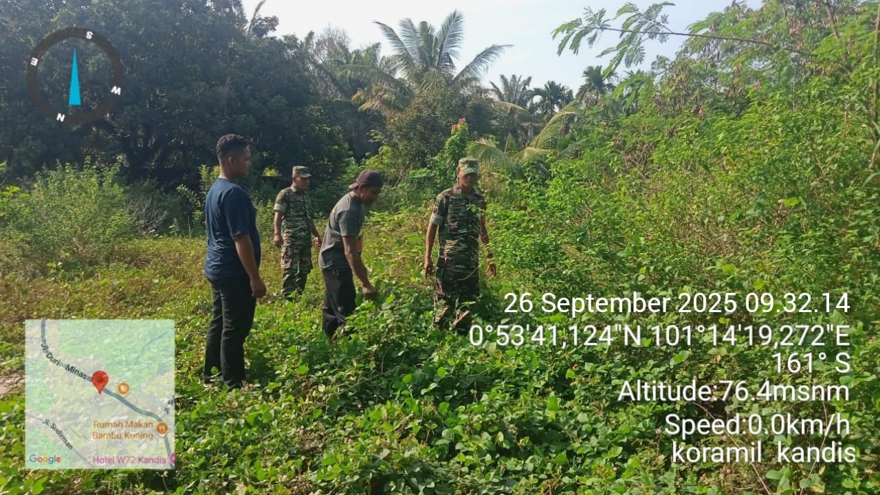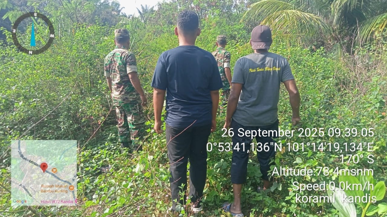 KANDIS – MATAHUKUM.ID – Babinsa Koramil 05/Pwk Kandis, Sertu Suriyadi dan Serda Edy Simanjuntak bersama warga tempatan melaksanakan kegiatan Patroli Kebakaran Hutan dan Lahan di sejumlah perkebunan serta lahan masyarakat yang dianggap rawan kebakaran diwilayah Kelurahan Kandis Kota Kecamatan Kandis Kabupaten Siak, Riau. Jumat, 26 September 2025.