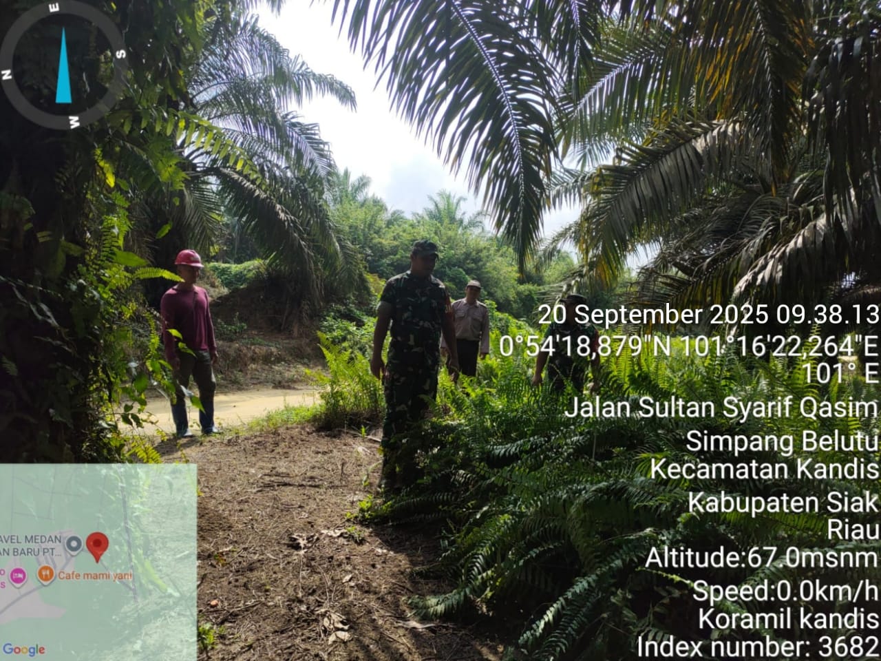 KANDIS – MATAHUKUM.ID – Babinsa Koramil 05/Pwk Kandis yaitu Sertu Bosur Siregar dan Serda D. Gultom melaksanakan kegiatan patroli karhutla, hari ini memasuki wilayah Kampung Sam Sam Kecamatan Kandis Kabupaten Siak, Riau. Sabtu, 20 September 2025.