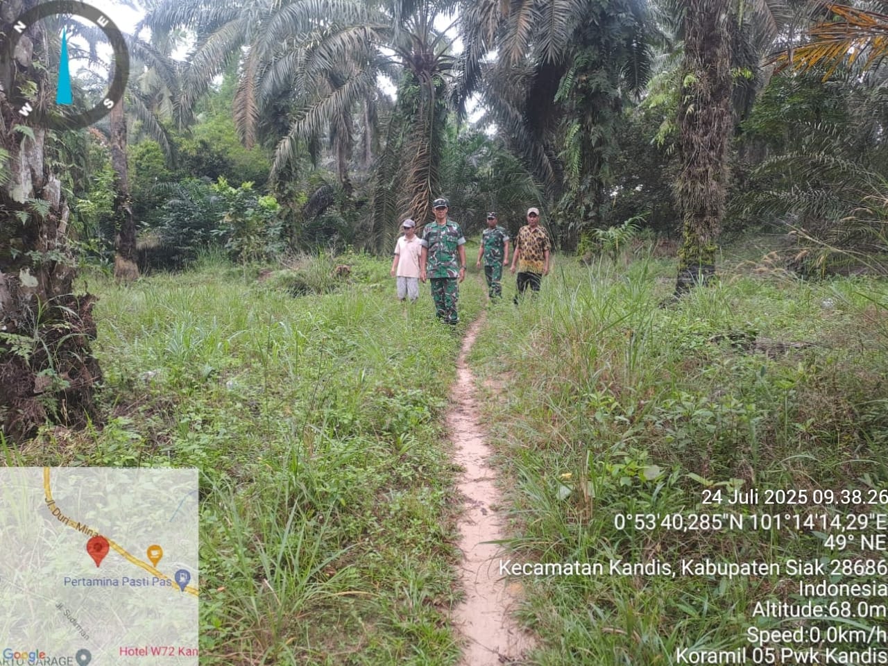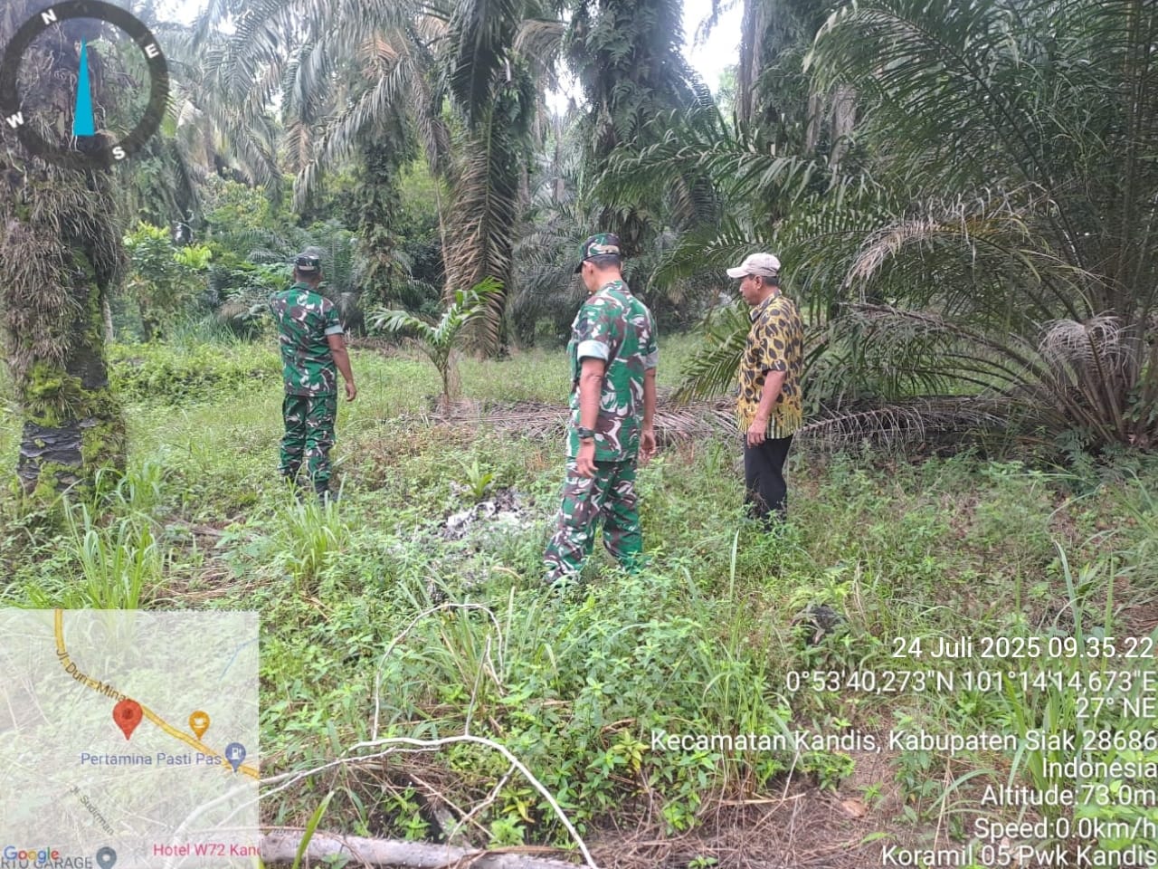 KANDIS – MATAHUKUM.ID – Babinsa Koramil 05/Kandis Kodim 0322 /Siak Sertu Julia Darma dan Sertu Andi Satria bersama beberapa warga melaksanakan kegiatan Patroli Kebakaran Hutan dan Lahan di sejumlah perkebunan serta lahan masyarakat yang dianggap rawan kebakaran diwilayah Kelurahan Telaga Sam Sam Kecamatan Kandis Kabupaten Siak, Riau. Kamis, 24 Juli 2025.