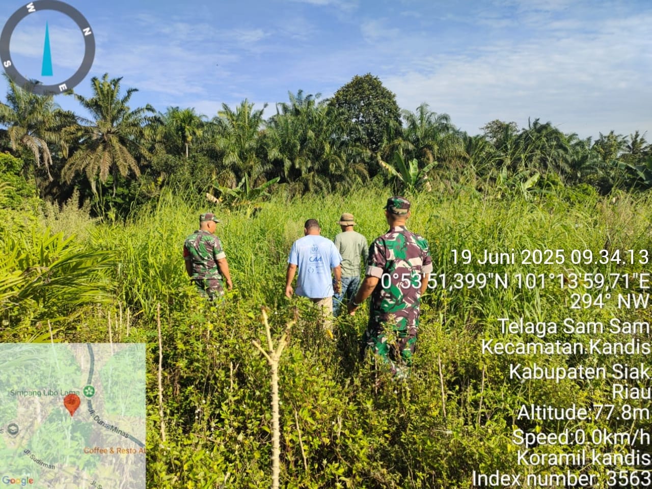 KANDIS – MATAHUKUM.ID – Babinsa Koramil 05/Kandis Kodim 0322 /Siak Sertu Suriyadi dan Serda D. Gultom bersama beberapa warga tempatan melaksanakan kegiatan Patroli Kebakaran Hutan dan Lahan di sejumlah perkebunan serta lahan masyarakat yang dianggap rawan kebakaran diwilayah Kelurahan Telaga Sam Sam Kecamatan Kandis Kabupaten Siak, Riau. Kamis, 19 Juni 2025.