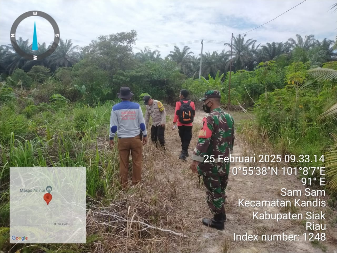 Babinsa Sertu Sutikno bersama rekannya Serda Edy Simanjuntak menyatakan, ” Bahwa hari ini disaat pihaknya bersama dua orang warga melaksanakan patroli karhutlah diarea lahan rawan terbakar wilayah Kampung Sam Sam pada situasi kondisi cuaca cerah.