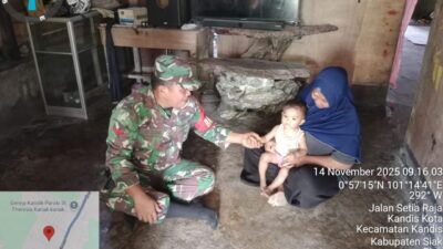 KANDIS – MATAHUKUM.ID – Dalam rangka memutus stunting di wilayah Kecamatan Kandis maka dari itu, Anggota Koramil 05/ Pwk Kandis Kodim 0322 /Siak yakni Babinsa Koptu K. Sitohang melakukan kegiatan pengecekan anak stunting yang terdapat di Kelurahan Kandis Kota Kecamatan Kandis Kabupaten Siak, Riau. Jumat, 14 November 2025.