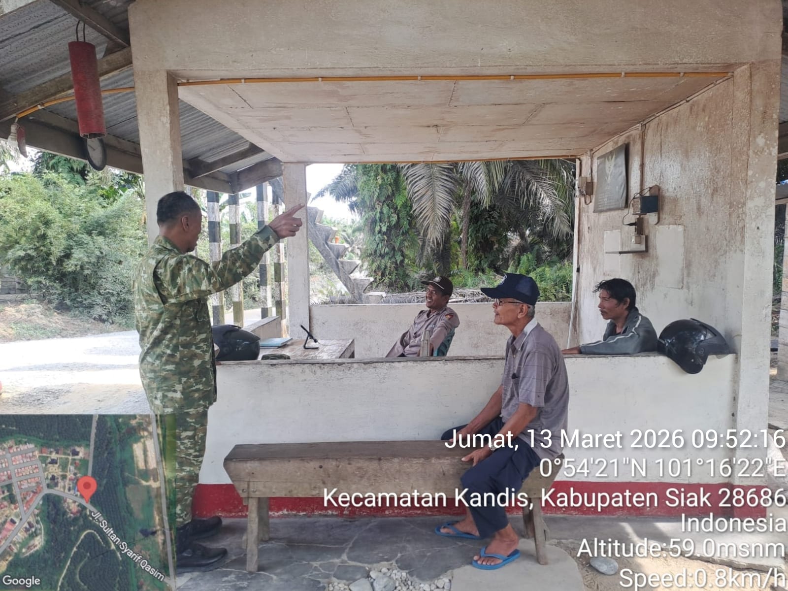 Sebelum patroli pengamanan Line Pipa PHR dilakukan, Babinsa Sertu Abdul Arfan bersama rekannya Koptu I Ketut Budiasa melaksanakan Bin Komsos tentang SKK Migas dengan warga di Pondok I Sam Sam Kampung Bekalar Kecamatan Kandis.