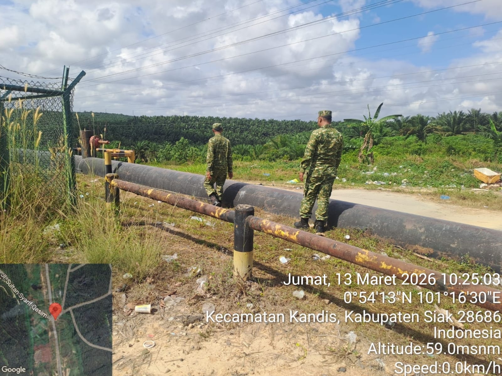 Setelah usai melakukan Bin Komsos Babinsa Peltu Yus Armin bersama rekannya Sertu Andi Satria pada pukul 10 : 36 Wib melaksanakan patroli di long line pipa area jalan Caltex Kampung Bekalar dan pada pukul 11 : 47 Wib, Babinsa Peltu Yus Armin bersama rekannya Sertu Andi Satria berpindah tempat, melaksanakan lagi patroli di long line pipa di Mindal Kelurahan Simpang Belutu.