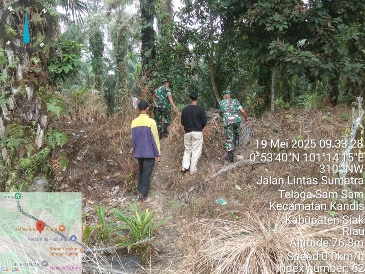 Babinsa Peltu Rahman S bersama rekannya Sertu Abdul Arfan menyebutkan,” Bahwa hari ini disaat pihaknya bersama dua orang warga tempatan melaksanakan patroli karhutlah diarea lahan rawan terbakar di wilayah Kelurahan Telaga Sam Sam pada situasi kondisi cuaca mendung.