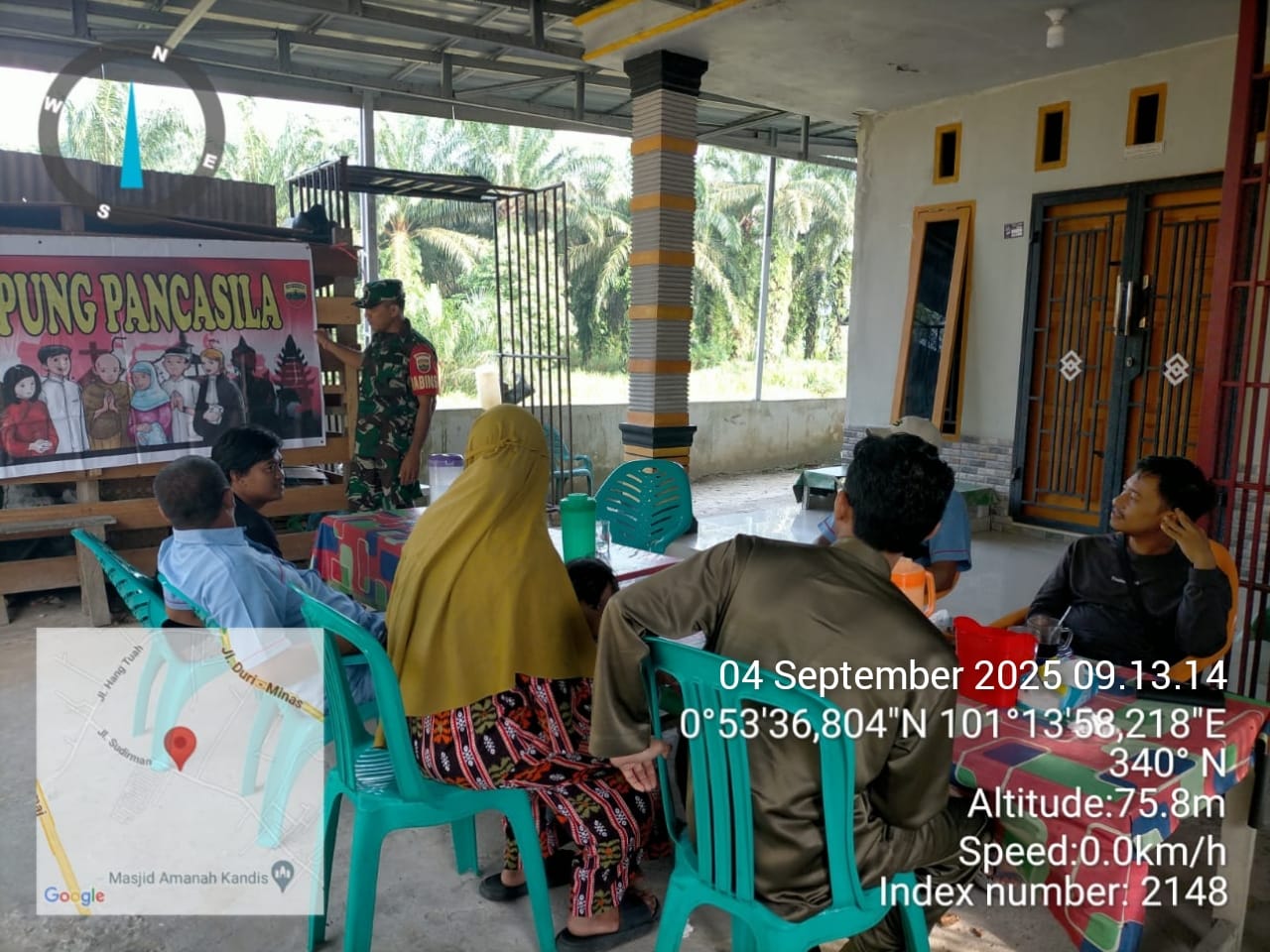 KANDIS – MATAHUKUM.ID – Babinsa Koramil 05/Pwk Kandis Kodim 0322 /Siak, Koptu I Ketut Budiasa melaksanakan Komsos serta menyampaikan tentang nilai – nilai Pancasila kepada sejumlah warga yang berada di Kelurahan Telaga Sam Sam Kecamatan Kandis Kabupaten Siak, Riau. Kamis, 4 September 2025.
