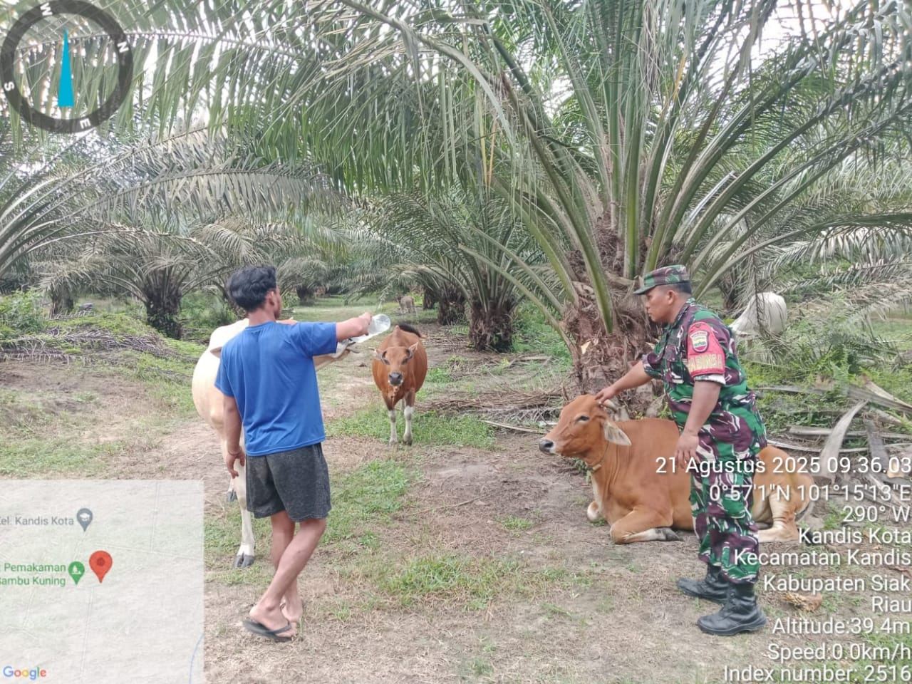 Kandis – Matahukum.id – Babinsa Koramil 05/Pwk Kandis, Kodim 0322/Siak, Koptu K. Sitohang hari ini melaksanakan pendampingan Vaksinasi Penyakit Mulut dan Kuku (PMK) hewan sapi ternak di Kelurahan Kandis Kota Kecamatan Kandis Kabupaten Siak, Riau. Kamis, 21 Agustus 2025.