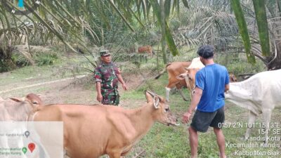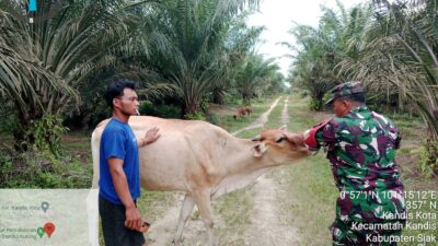KANDIS – MATAHUKUM.ID – Babinsa Koramil 05/Pwk Kandis, Kodim 0322/Siak, Koptu K. Sitohang hari ini melaksanakan pendampingan Vaksinasi Penyakit Mulut dan Kuku (PMK) hewan sapi ternak di Kelurahan Kandis Kota Kecamatan Kandis Kabupaten Siak, Riau. Selasa, 25 November 2025.