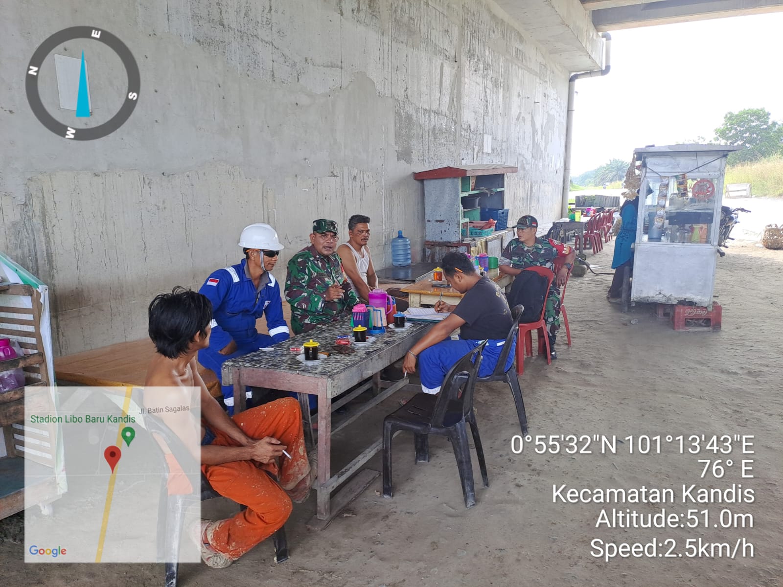 Sebelum patroli pengamanan Line Pipa PHR dilakukan, Babinsa Sertu Suriyadi bersama rekannya Serda Satria Marni melaksanakan Bin Komsos tentang SKK Migas dengan warga di jalan Simpang Libo Baru Kelurahan Kandis Kota Kecamatan Kandis.