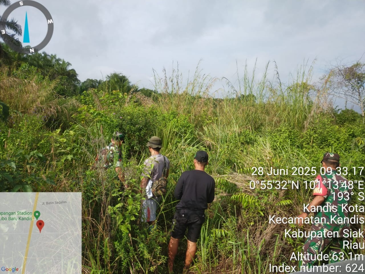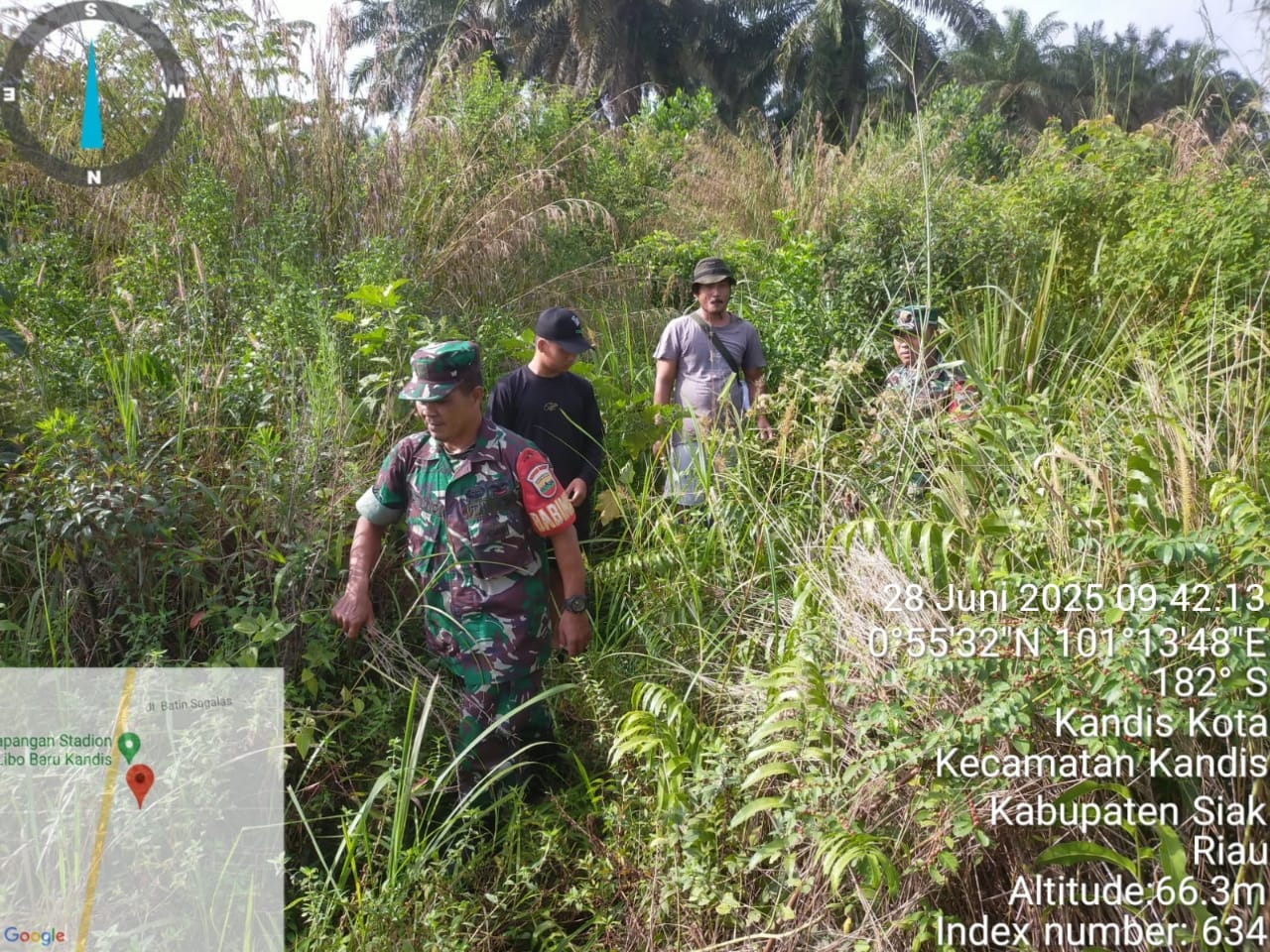 KANDIS – MATAHUKUM.ID – Babinsa Koramil 05/Kandis Kodim 0322 /Siak Sertu Sutikno dan Kopda Dedi Irawan bersama beberapa warga tempatan melaksanakan kegiatan Patroli Kebakaran Hutan dan Lahan di sejumlah perkebunan serta lahan masyarakat yang dianggap rawan kebakaran diwilayah Kelurahan Simpang Belutu Kecamatan Kandis Kabupaten Siak, Riau. Sabtu, 28 Juni 2025.