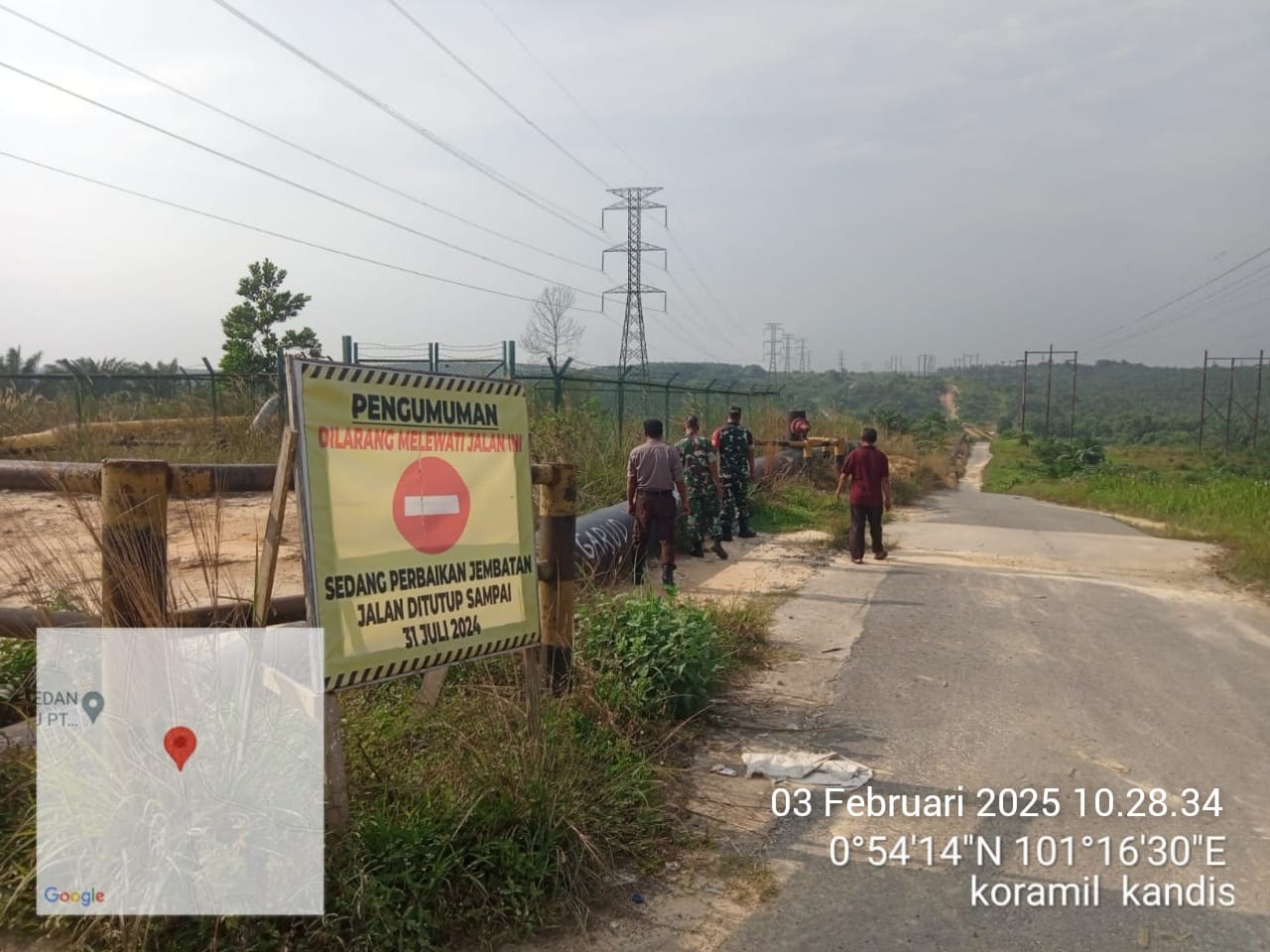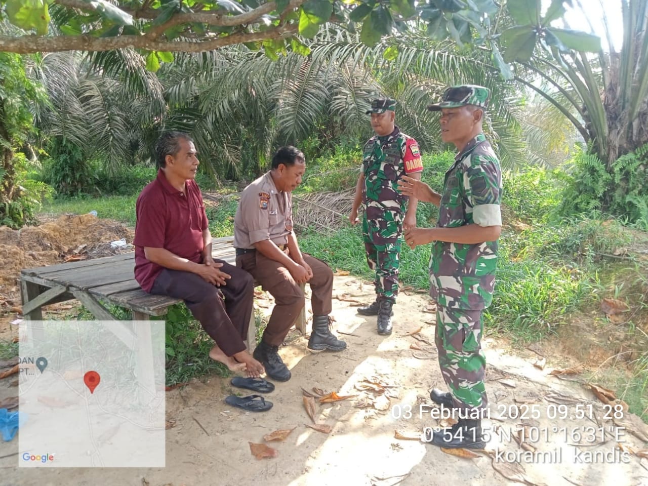 Babinsa Sertu Aprianto bersama Koptu K. Sitohang pukul 10 : 35 Wib melaksanakan patroli di GS – 5 Pertamina Kelurahan Simpang Belutu dan pada pukul 11 : 45 Wib melaksanakan patroli di Area Rimba Raya Kelurahan Simpang Belutu.