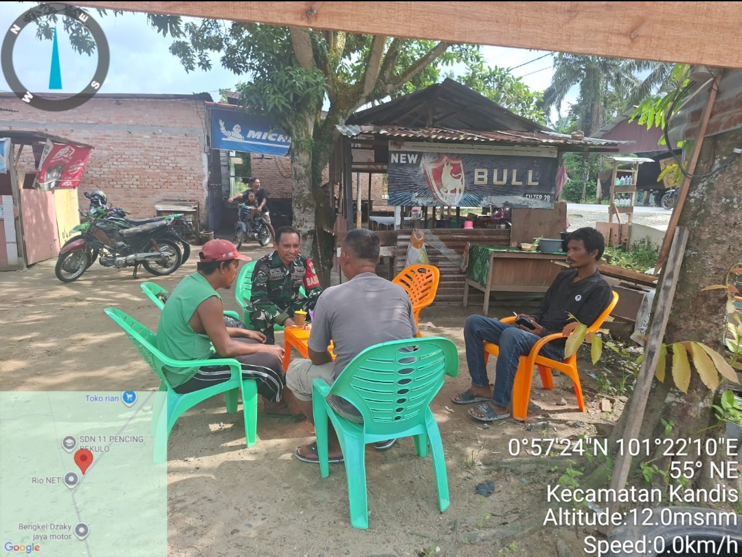 Sebelum patroli pengamanan Line Pipa PHR dilakukan, Babinsa Serka Aprianto bersama rekannya Sertu Korenus JU melaksanakan Bin Komsos tentang SKK Migas dengan warga di Dusun Pencing Lestari Kampung Pencing Bekulo Kecamatan Kandis.