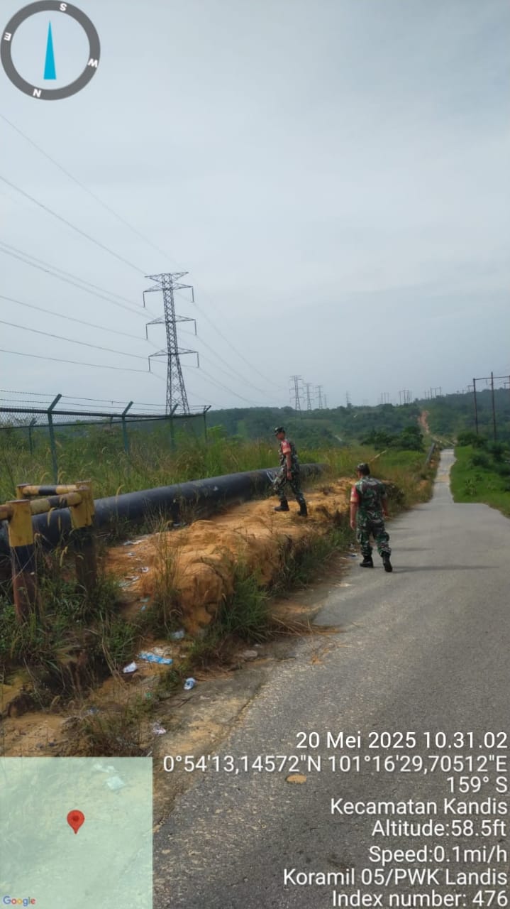 Babinsa Sertu Korenus JU bersama Sertu Ridho Utomo, pada pukul 10 : 32 Wib melaksanakan patroli di Long Line Pipa diarea Mindal 5 Kampung Bekalar dan pada pukul 11 : 43 Wib melaksanakan patroli long line pipa jalan tanah Caltex Simpang Gelombang Kampung Bekalar.