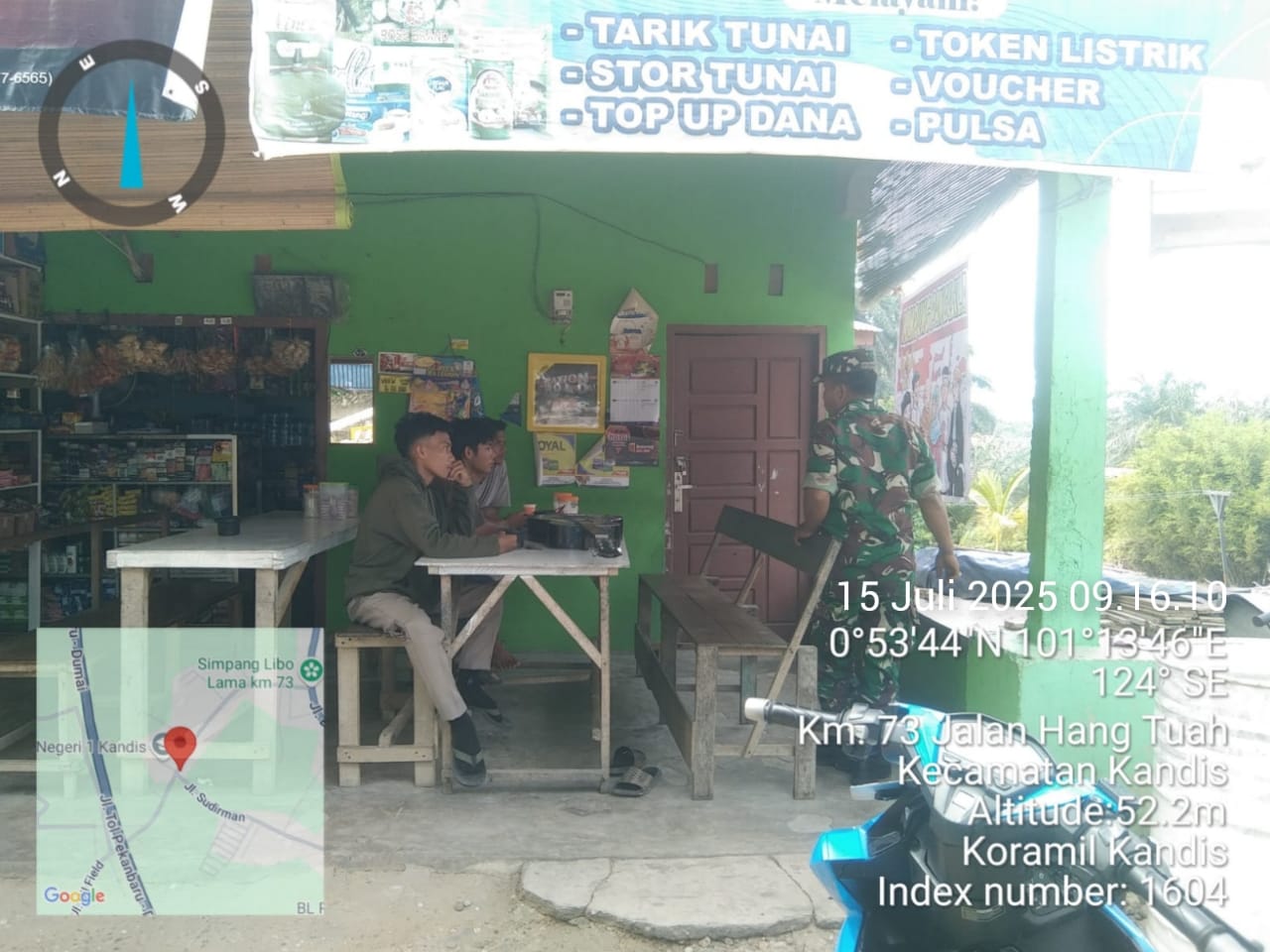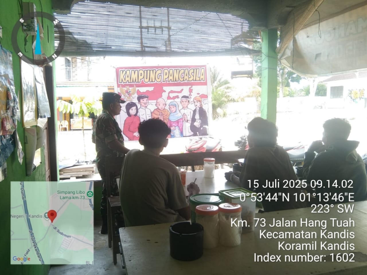 KANDIS – MATAHUKUM.ID – Babinsa Koramil 05/Pwk Kandis Kodim 0322 /Siak, Serda Edy Simanjuntak melaksanakan Komsos serta menyampaikan tentang nilai – nilai Pancasila kepada sejumlah warga di Kelurahan Telaga Sam Sam Kecamatan Kandis Kabupaten Siak, Riau. Selasa, 15 Juli 2025.