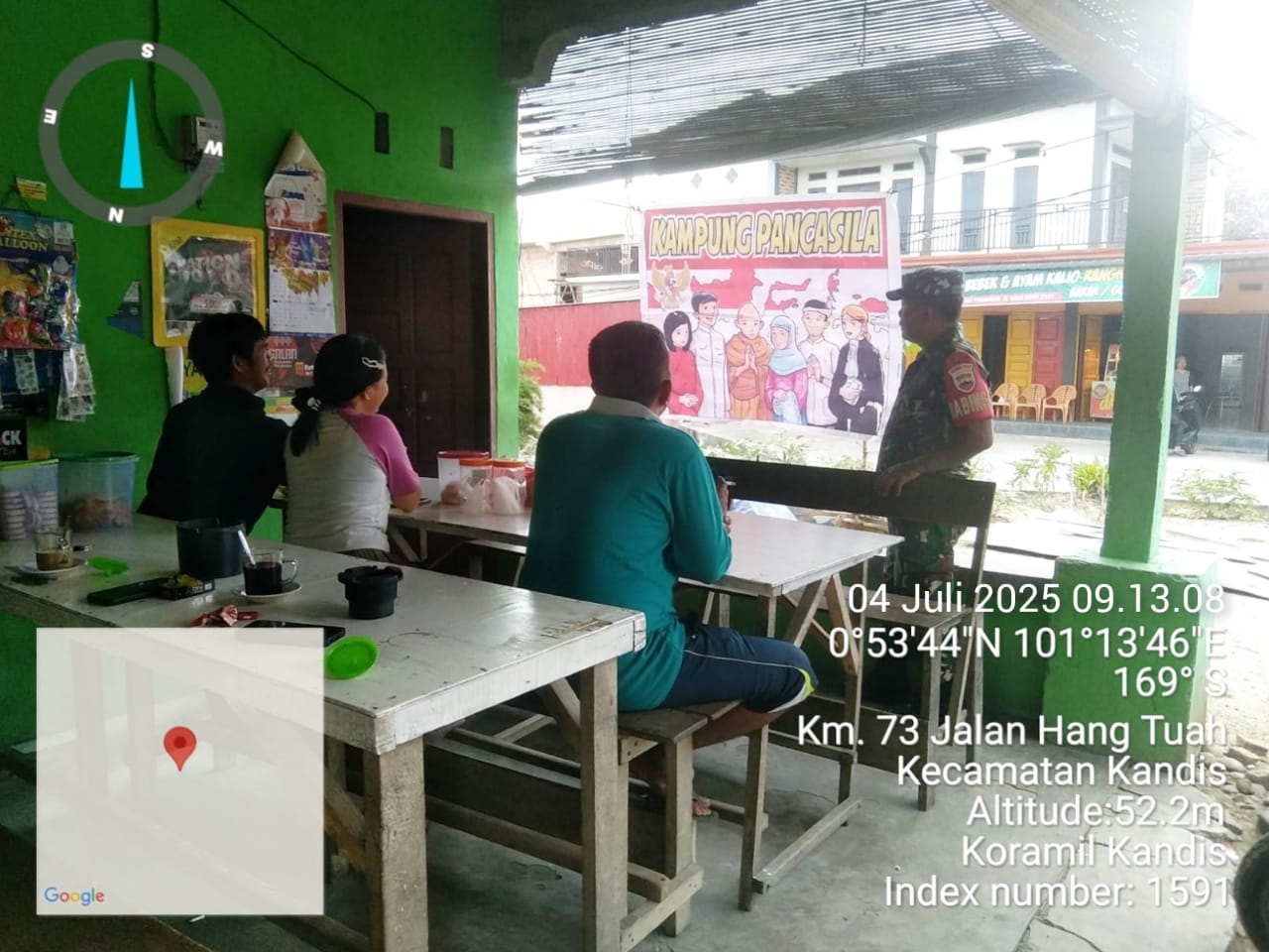 KANDIS – MATAHUKUM.ID – Babinsa Koramil 05/Pwk Kandis Kodim 0322 /Siak, Serda Edy Simanjuntak melaksanakan Komsos serta menyampaikan tentang nilai – nilai Pancasila kepada sejumlah warga di Kelurahan Telaga Sam Sam Kecamatan Kandis Kabupaten Siak, Riau. Jumat, 4 Juli 2025.