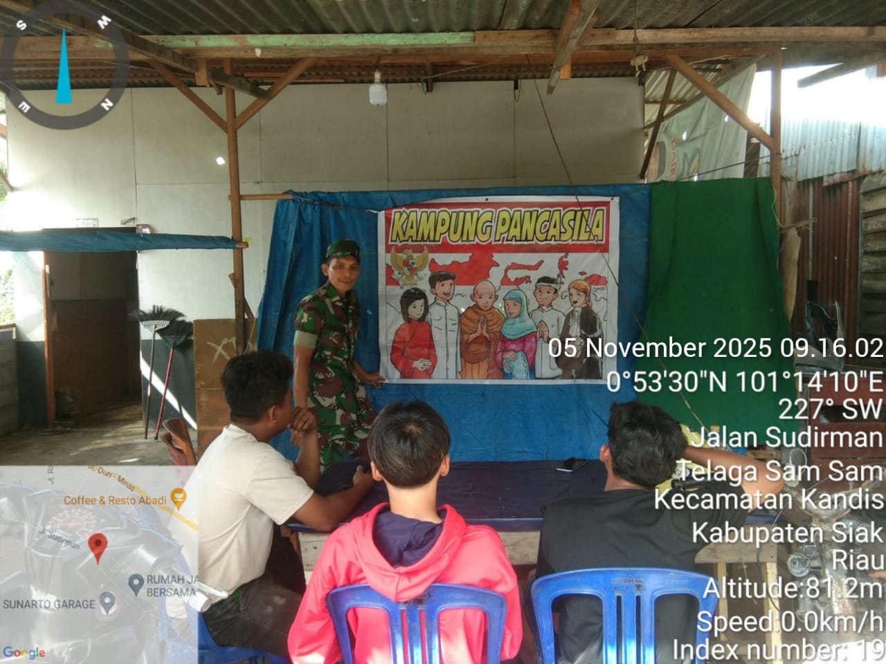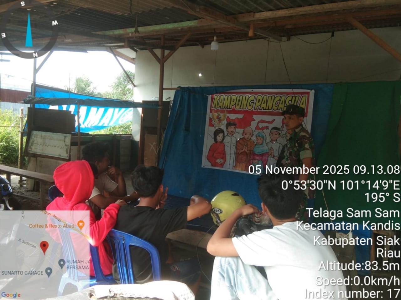 KANDIS – MATAHUKUM.ID – Babinsa Koramil 05/Pwk Kandis Kodim 0322 /Siak, Sertu Abdul Arfan melaksanakan Komsos serta menyampaikan tentang nilai – nilai Pancasila kepada sejumlah warga yang berada di Kelurahan Telaga Sam Sam Kecamatan Kandis Kabupaten Siak, Riau. Rabu, 5 November 2025.