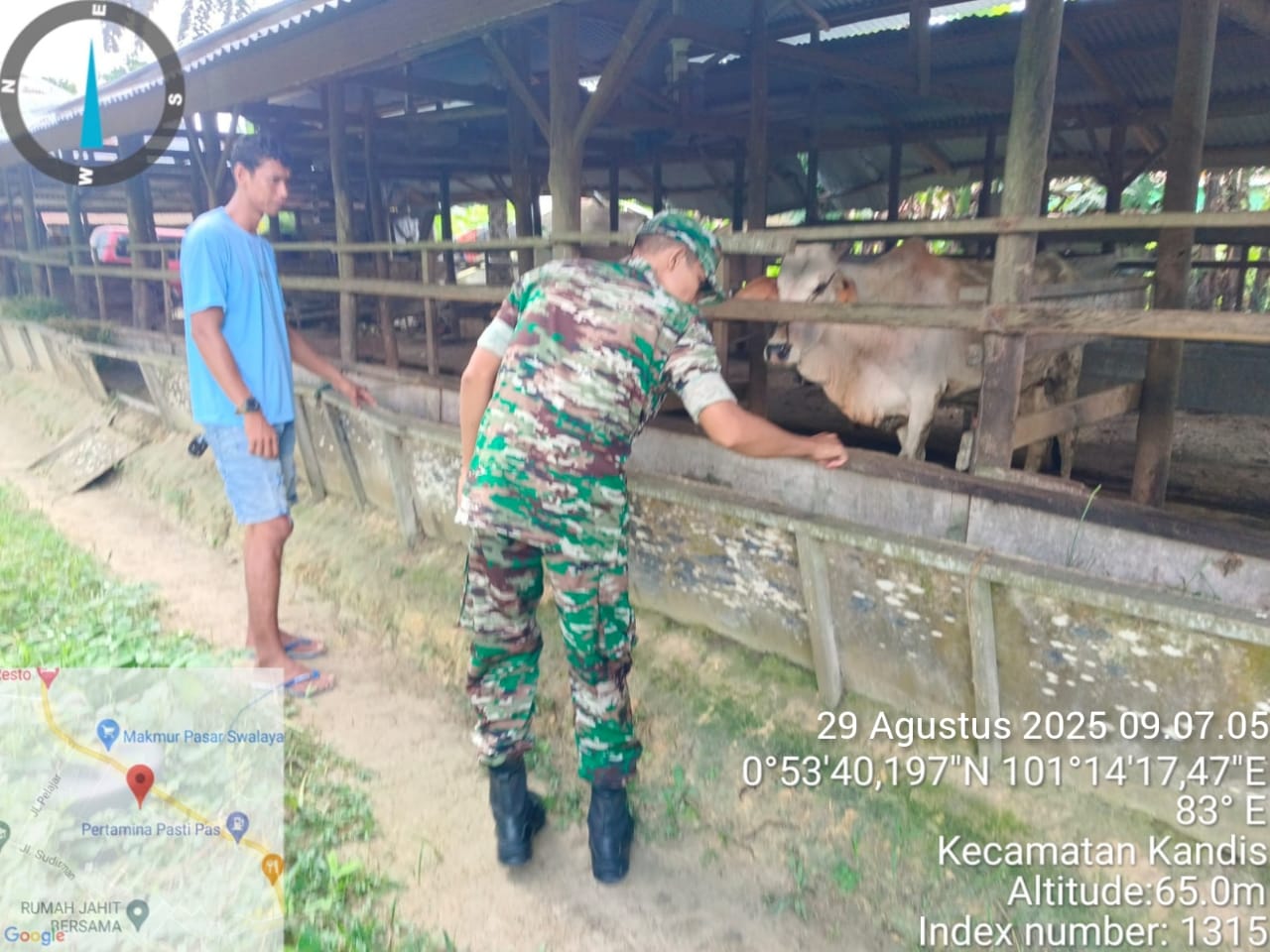 KANDIS – MATAHUKUM.ID – Babinsa Koramil 05/Pwk Kandis, Kodim 0322/Siak, Sertu Abdul Arfan hari ini melaksanakan pendampingan Vaksinasi Penyakit Mulut dan Kuku (PMK) hewan sapi ternak di Kelurahan Telaga Sam Sam Kecamatan Kandis Kabupaten Siak, Riau. Jumat, 29 Agustus 2025.