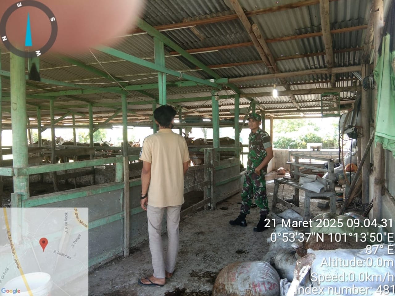 KANDIS – MATAHUKUM.ID – Babinsa Koramil 05/Pwk Kandis, Kodim 0322/Siak, Sertu Abdul Arfan hari ini melaksanakan pendampingan Vaksinasi Penyakit Mulut dan Kuku (PMK) hewan sapi ternak di Kelurahan Telaga Sam Sam Kecamatan Kandis Kabupaten Siak, Riau. Jumat, 21 Maret 2025.