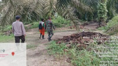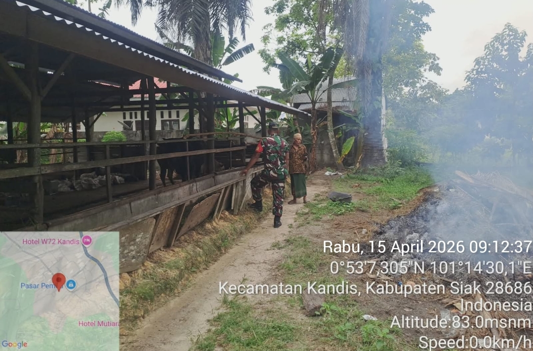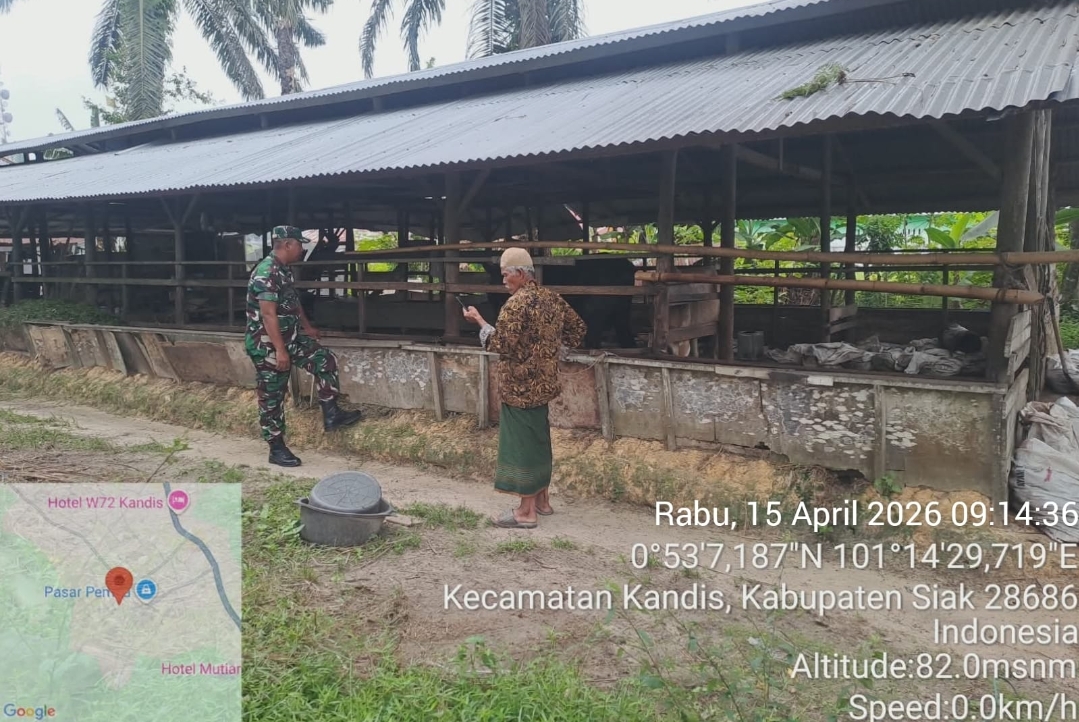 KANDIS – MATAHUKUM.ID – Babinsa Koramil 05/Pwk Kandis, Kodim 0322/Siak, Sertu Andi Satria melaksanakan pendampingan Vaksinasi Penyakit Mulut dan Kuku (PMK) hewan sapi ternak di jalan Raja Kecik RT 01 RW 02 Kelurahan Telaga Sam Sam Kecamatan Kandis Kabupaten Siak, Riau. Rabu, 15 April 2026.