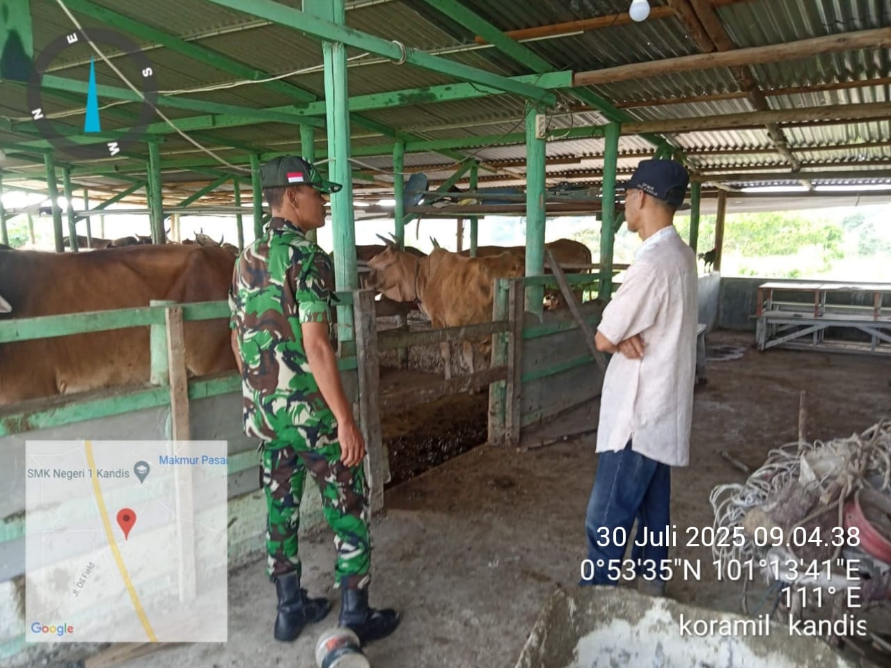 KANDIS – MATAHUKUM.ID – Babinsa Koramil 05/Pwk Kandis, Kodim 0322/Siak, Sertu Aprianto hari ini melaksanakan pendampingan Vaksinasi Penyakit Mulut dan Kuku (PMK) hewan sapi ternak di Kampung Sungai Gondang Kecamatan Kandis Kabupaten Siak, Riau. Rabu, 30 Juli 2025.