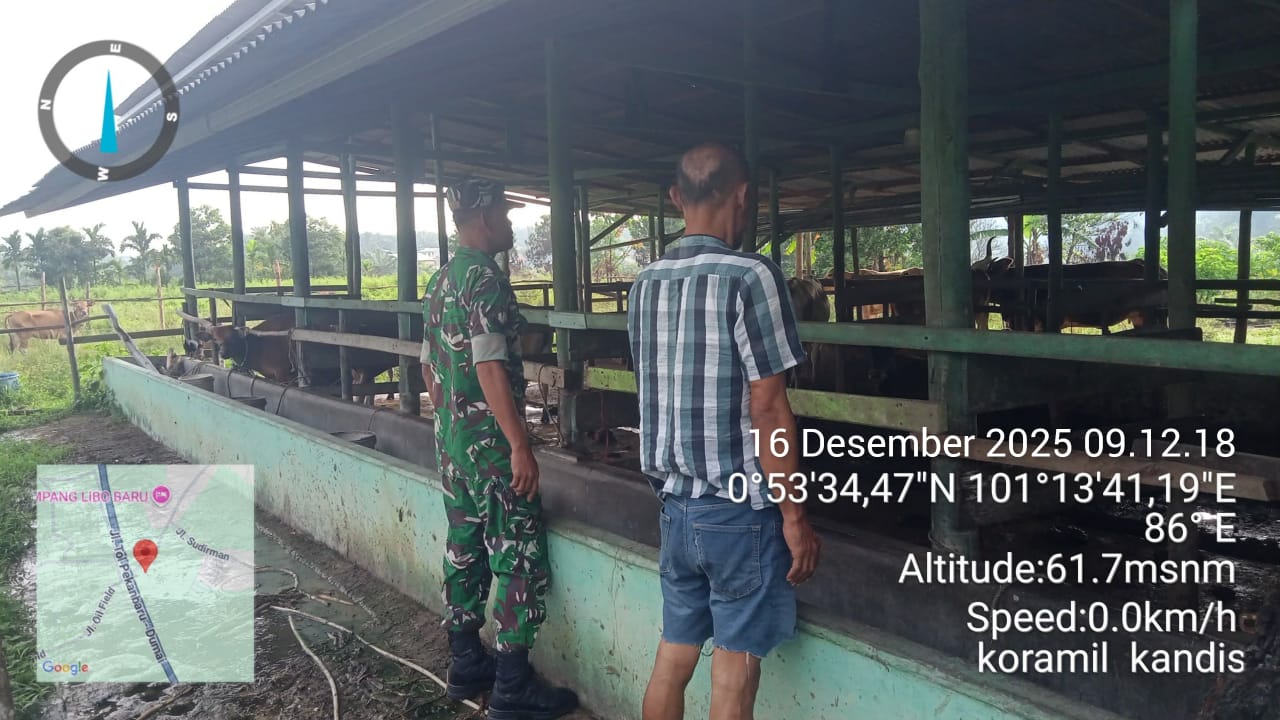 KANDIS – MATAHUKUM.ID – Babinsa Koramil 05/Pwk Kandis, Kodim 0322/Siak, Sertu Aprianto hari ini melaksanakan pendampingan Vaksinasi Penyakit Mulut dan Kuku (PMK) hewan sapi ternak di Kampung Sungai Gondang Kecamatan Kandis Kabupaten Siak, Riau. Selasa, 16 Desember 2025.