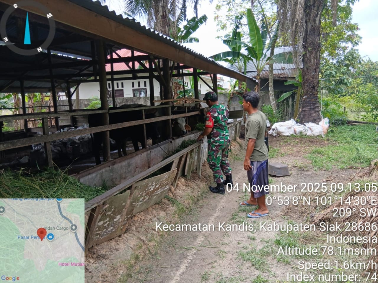 KANDIS – MATAHUKUM.ID – Babinsa Koramil 05/Pwk Kandis, Kodim 0322/Siak, Sertu Bosur Siregar hari ini melaksanakan pendampingan Vaksinasi Penyakit Mulut dan Kuku (PMK) hewan sapi ternak di Kampung Libo Jaya Kecamatan Kandis Kabupaten Siak, Riau. Selasa, 4 November 2025.