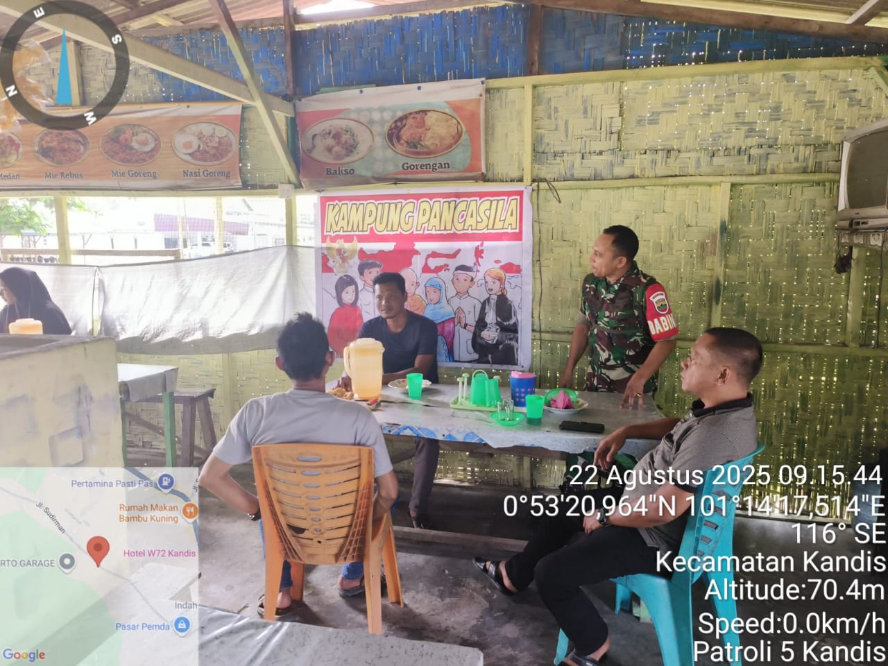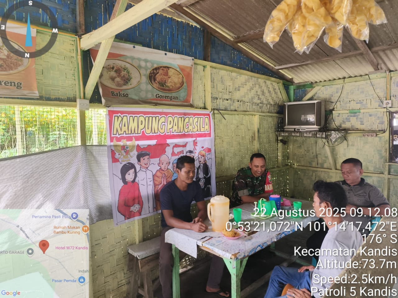 KANDIS – MATAHUKUM.ID – Babinsa Koramil 05/Pwk Kandis Kodim 0322 /Siak, Sertu Korenus JU melaksanakan Komsos serta menyampaikan tentang nilai – nilai Pancasila kepada sejumlah warga yang berada di Kelurahan Telaga Sam Sam Kecamatan Kandis Kabupaten Siak, Riau. Jumat, 22 Agustus 2025.