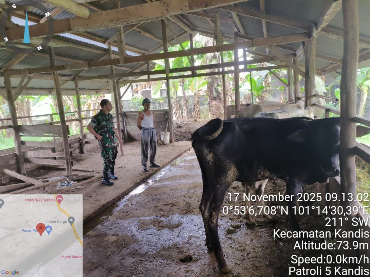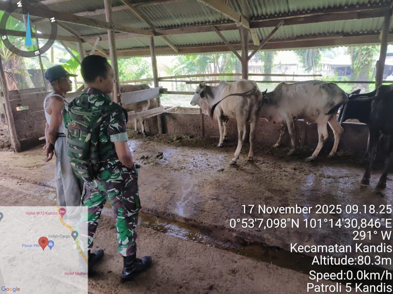 KANDIS – MATAHUKUM.ID – Babinsa Koramil 05/Pwk Kandis, Kodim 0322/Siak, Sertu Korenus JU hari ini melaksanakan pendampingan Vaksinasi Penyakit Mulut dan Kuku (PMK) hewan sapi ternak di Kampung Pencing Bekulo Kecamatan Kandis Kabupaten Siak, Riau. 17 November 2025.