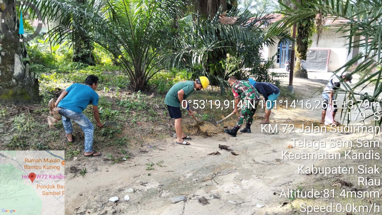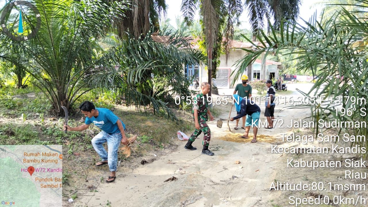 KANDIS – MATAHUKUM.ID – Babinsa Koramil 05/Kandis Kodim 0322 /Siak. Sertu Ridho Utomo hari ini melaksanakan kegiatan gotong royong yaitu membantu melakukan pembersihan jalan warga di Kelurahan Telaga Sam Sam Kecamatan Kandis Kabupaten Siak, Riau. Sabtu, 21 Februari 2026.