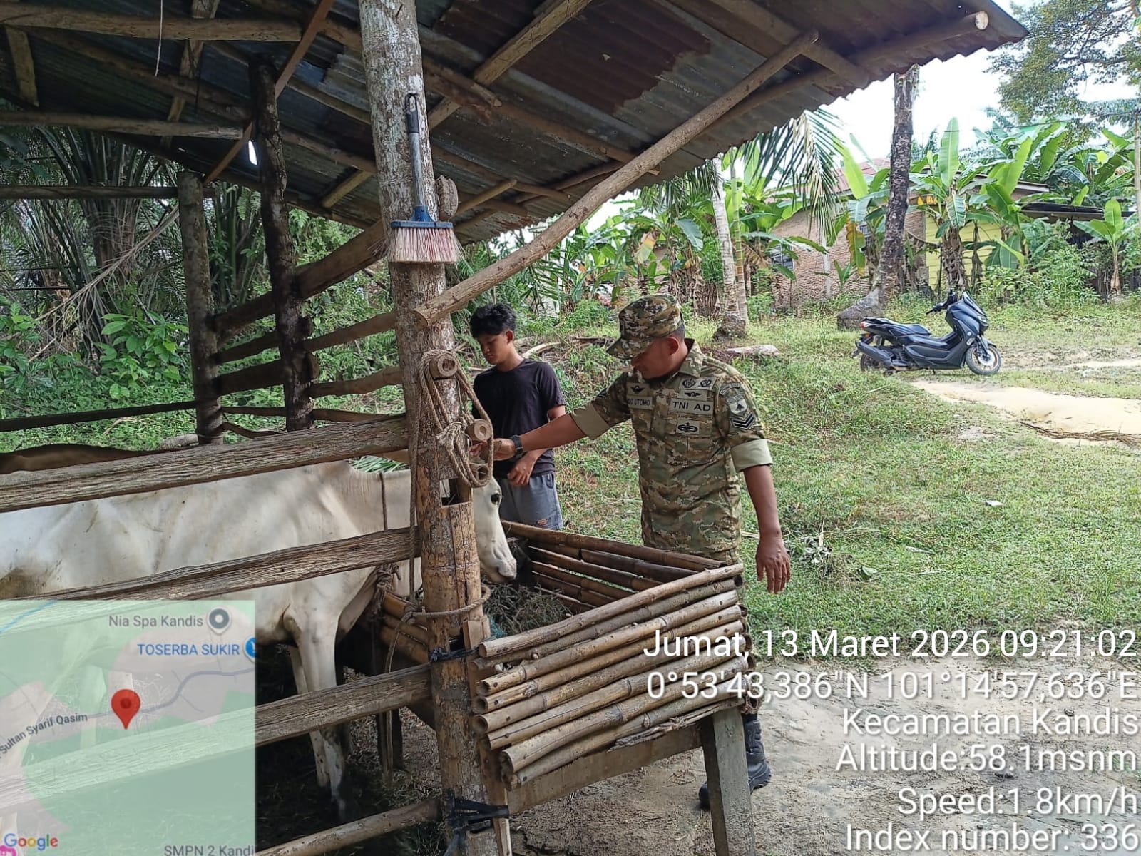 KANDIS – MATAHUKUM.ID – Babinsa Koramil 05/Pwk Kandis, Kodim 0322/Siak, Serda Ridho Utomo melaksanakan pendampingan Vaksinasi Penyakit Mulut dan Kuku (PMK) hewan sapi ternak di Kampung Belutu Kecamatan Kandis Kabupaten Siak, Riau. Jumat, 13 Maret 2026.