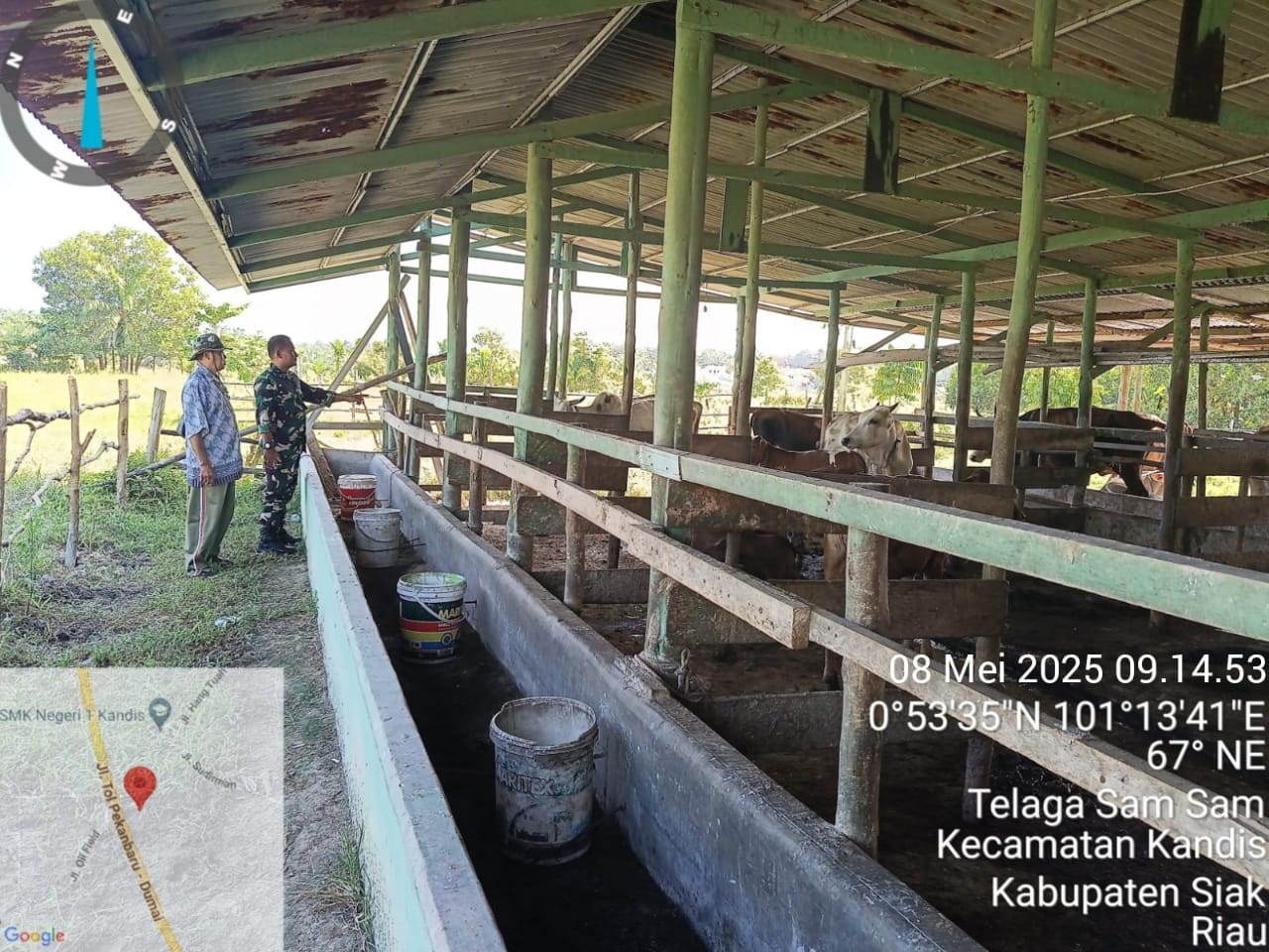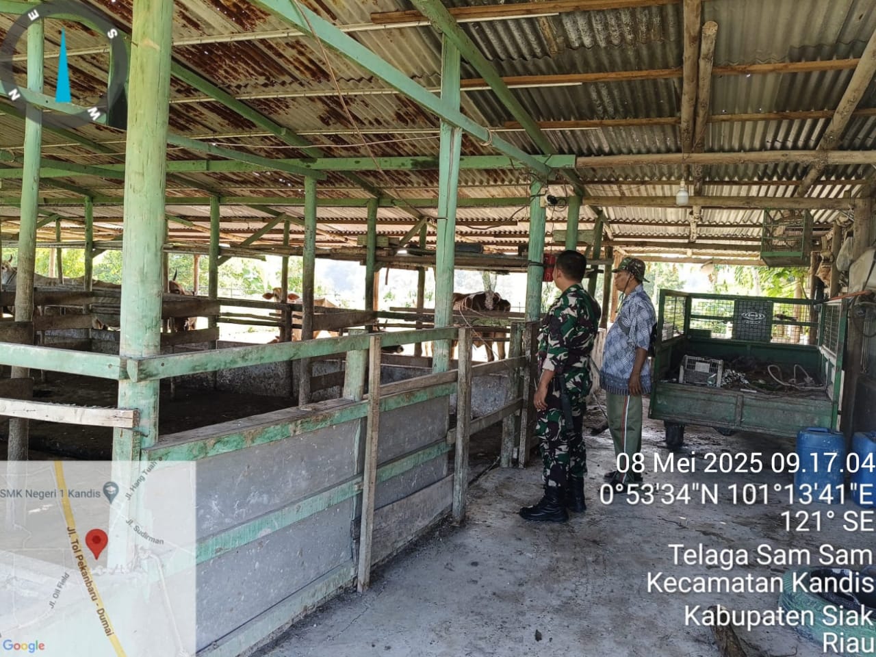 KANDIS – MATAHUKUM.ID – Babinsa Koramil 05/Pwk Kandis, Kodim 0322/Siak, Sertu Ridho Utomo hari ini melaksanakan pendampingan Vaksinasi Penyakit Mulut dan Kuku (PMK) hewan sapi ternak di Kampung Belutu Kecamatan Kandis Kabupaten Siak, Riau. Kamis, 8 Mei 2025.