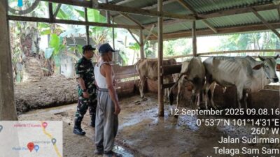 KANDIS – MATAHUKUM.ID – Babinsa Koramil 05/Pwk Kandis, Kodim 0322/Siak, Sertu Ridho Utomo hari ini melaksanakan pendampingan Vaksinasi Penyakit Mulut dan Kuku (PMK) hewan sapi ternak di Kampung Belutu Kecamatan Kandis Kabupaten Siak, Riau. Jumat, 12 September 2025.