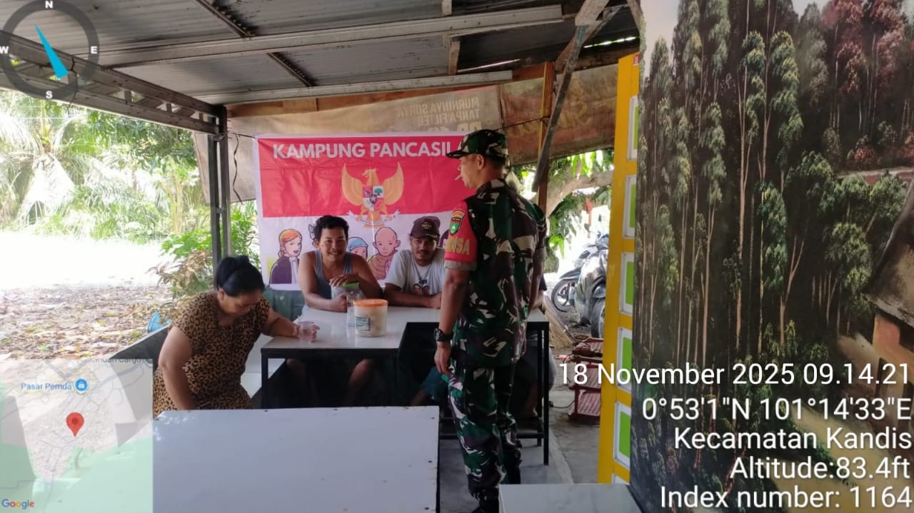 KANDIS – MATAHUKUM.ID – Babinsa Koramil 05/Pwk Kandis Kodim 0322 /Siak, Sertu Suriyadi melaksanakan Komsos serta menyampaikan tentang nilai – nilai Pancasila kepada sejumlah warga yang berada di Kelurahan Telaga Sam Sam Kecamatan Kandis Kabupaten Siak, Riau. Selasa, 18 November 2025.