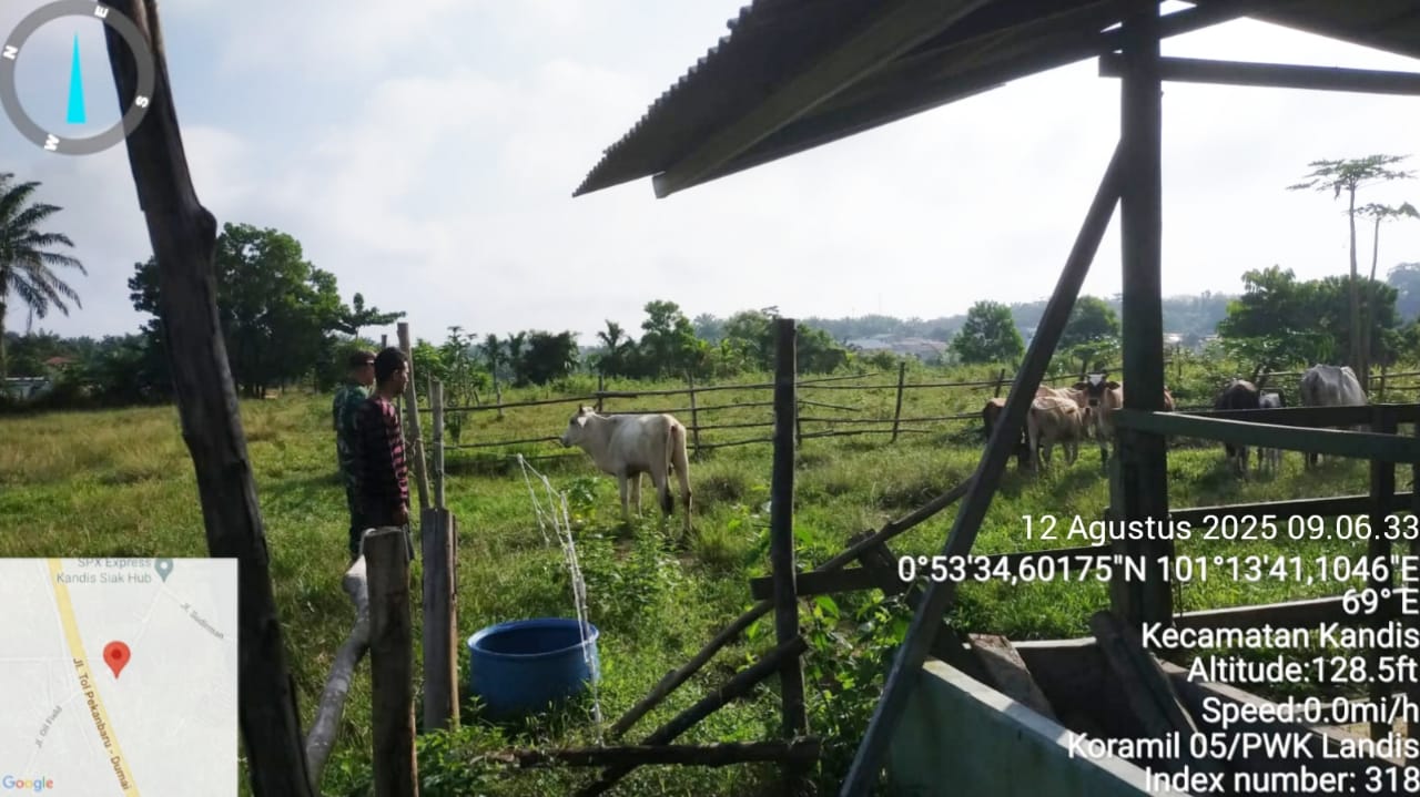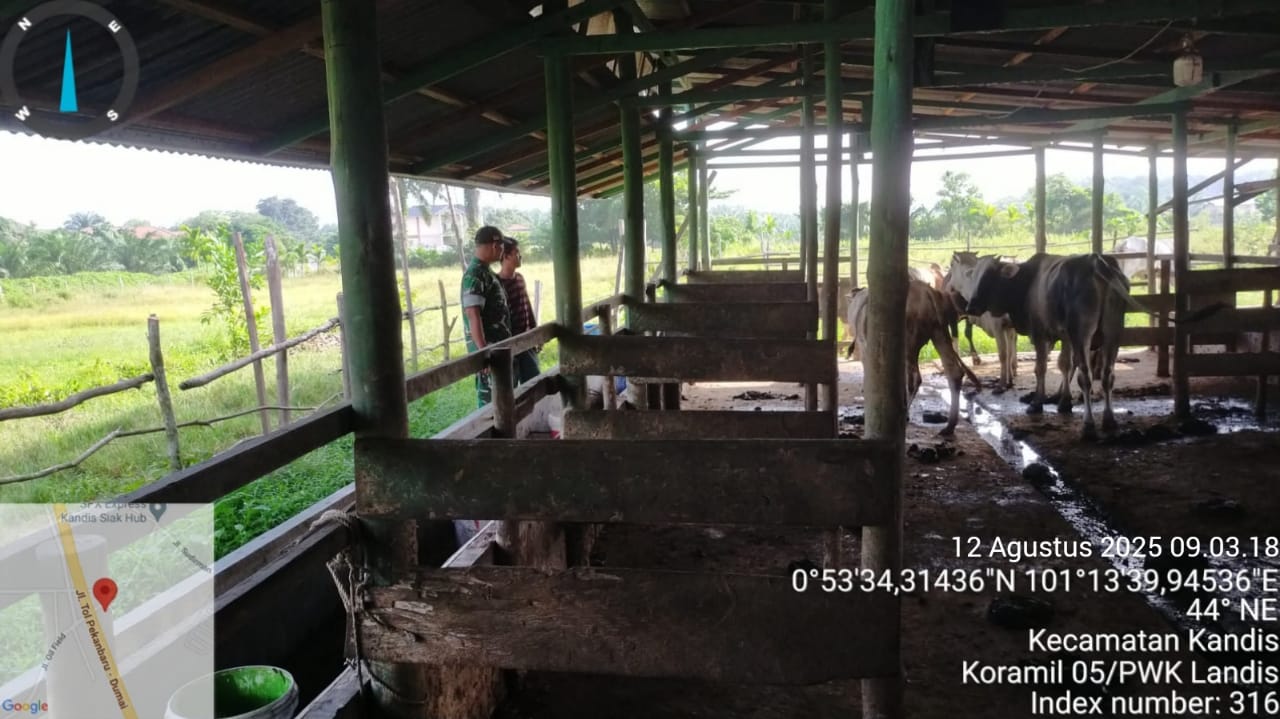 KANDIS – MATAHUKUM.ID – Babinsa Koramil 05/Pwk Kandis, Kodim 0322/Siak, Sertu Suriyadi hari ini melaksanakan pendampingan Vaksinasi Penyakit Mulut dan Kuku (PMK) hewan sapi ternak di Kampung Bekalar Kecamatan Kandis Kabupaten Siak, Riau. Selasa , 12 Agustus 2025.