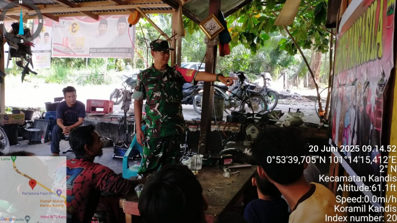 KANDIS – MATAHUKUM.ID – Babinsa Koramil 05/Pwk Kandis Kodim 0322 /Siak, Sertu Suriyadi melaksanakan Komsos serta menyampaikan tentang nilai – nilai Pancasila kepada sejumlah warga di Kelurahan Telaga Sam Sam Kecamatan Kandis Kabupaten Siak, Riau. Jumat, 20 Juni 2025.