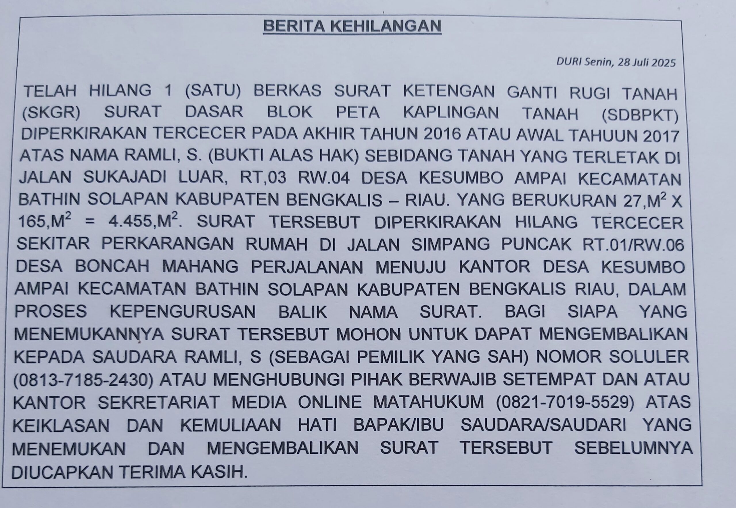 Telah hilang 1 (satu) berkas Surat Keterangan Ganti Rugi Tanah dan Surat Dasar Blok Peta Kaplingan Tanah diperkirakan tercecer pada akhir tahun 2016 atau awal tahun 2017 atasnama RAMLI, S (sebagai bukti alas hak tanah) Sebidang Tanah Yang Terletak di Jalan Sukajadi, RT.03/RW.04 Desa Kesumbo Ampai Kecamatan Bathin Solapan Kabupaten Bengkalis Riau.