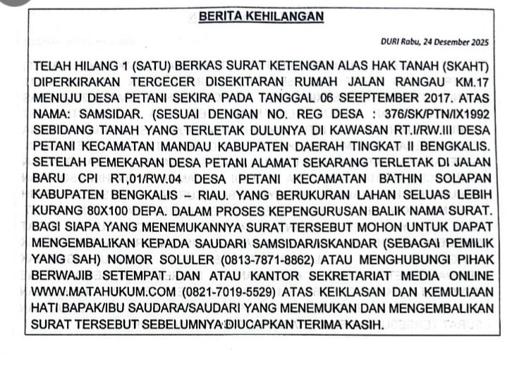 Setelah pemekaran Desa Petani alamat sekarang terletak di Jalan Baru CPI. RT 1/ RW 4 Desa Petani Kecamatan Nathin Solapan Kabupaten Bengkalis – Riau. Yang berukuran lahan seluas lebih kurang 80 x 100 Depa. Dalam proses kepengurusan balik nama surat. Bagi siapa yang menemukannya surat tersebut mohon untuk dapat mengembalikan kepada saudari Samsidar/Iskandar (sebagai pemilik yang sah) nomor seluler (081378718862) atau menghubungi pihak berwajib setempat dan atau kantor sekretariat media online www.matahukum.com (082170195529) atas keikhlasan dan kemuliaan hati bapak/ibu saudara/i yang menemukan dan mengembalikan surat tersebut sebelumnya diucapkan terimakasih.