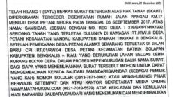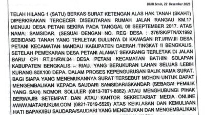 Telah hilang 1 (satu) berkas surat keterangan alas hak tanah (SKAHT) diperkirakan tercecer disekitaran rumah Jalan Rangau KM.17 menuju Desa Petani sekira pada tanggal 06 september 2017. Atas nama: Samsidar. (Sesuai dengan no. reg Desa Petani : 376/SK/PTN/IX 1992 sebidang tanah yang terletak dulunya dikawasan RT 1/ RW 3 Desa Petani Kecamatan Mandau Kabupaten Daerah tingkat II Bengkalis.