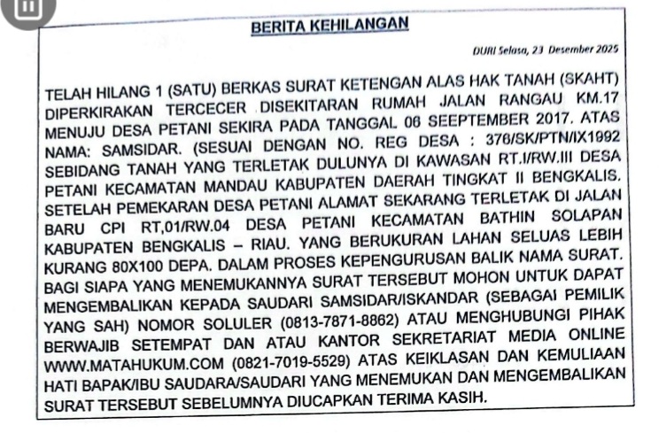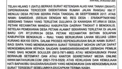 Setelah pemekaran Desa Petani alamat sekarang terletak di Jalan Baru CPI. RT 1/ RW 4 Desa Petani Kecamatan Nathin Solapan Kabupaten Bengkalis – Riau. Yang berukuran lahan seluas lebih kurang 80 x 100 Depa. Dalam proses kepengurusan balik nama surat. Bagi siapa yang menemukannya surat tersebut mohon untuk dapat mengembalikan kepada saudari Samsidar/Iskandar (sebagai pemilik yang sah) nomor seluler (081378718862) atau menghubungi pihak berwajib setempat dan atau kantor sekretariat media online www.matahukum.com (082170195529) atas keikhlasan dan kemuliaan hati bapak/ibu saudara/i yang menemukan dan mengembalikan surat tersebut sebelumnya diucapkan terimakasih.