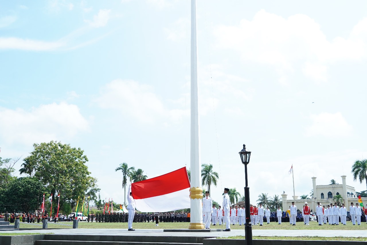 SIAK – MATAHUKUM.ID – Upacara Pengibaran Bendera Merah Putih dalam rangka memperingati Hari Ulang Tahun (HUT) ke-80 Kemerdekaan Republik Indonesia berlangsung khidmat di Lapangan Tugu depan Istana Siak, Jalan Sultan Syarif Kasim, Kelurahan Kampung Dalam, Kecamatan Siak, Kabupaten Siak. Kegiatan dimulai pukul 09.45 WIB dengan diikuti sekitar 700 peserta upacara dan tamu undangan.