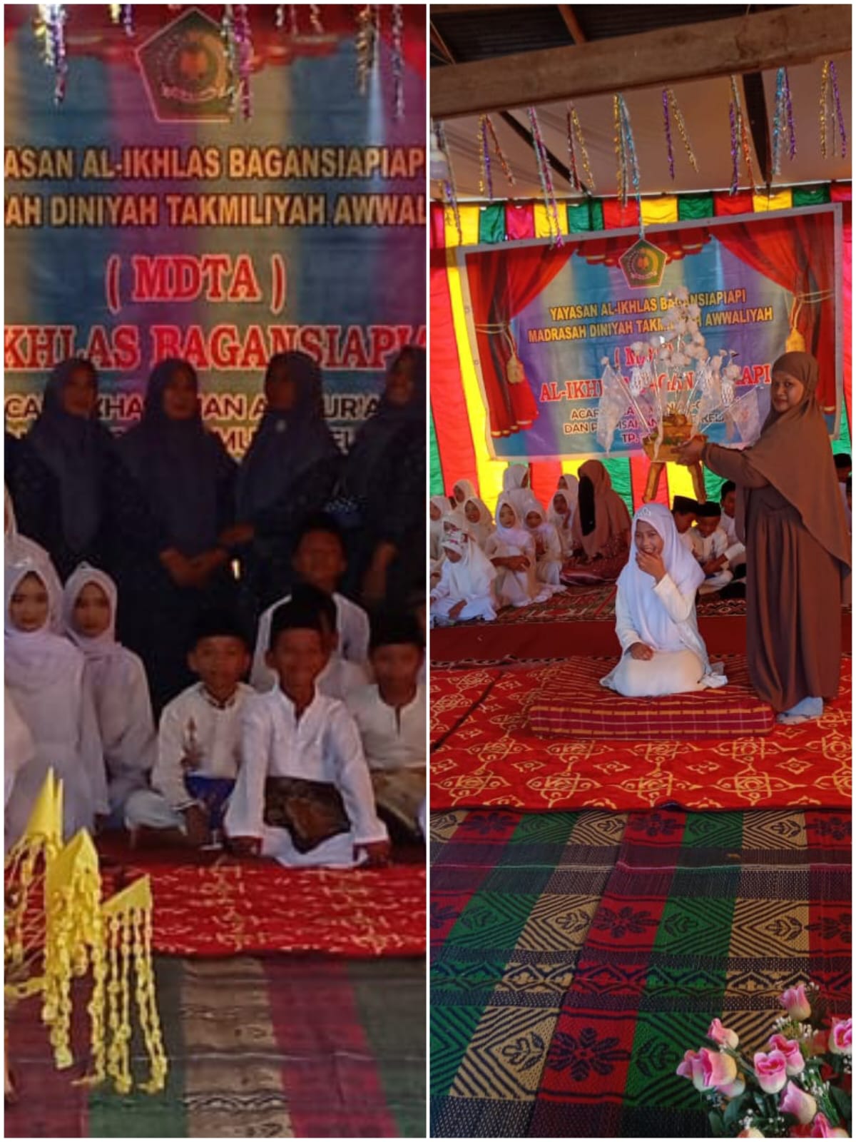 MATAHUKUM.ID/Bagansiapiapi,Rohil– Sebanyak 42 santri Madrasah Diniyah Takmiliyah Awaliyah (MDTA) AL-IKHLAS Bagansiapiapi gelar acara Khataman Al-Qur’an dan Perpisahan.Jalan Pelabuhan Baru,Kecamatan Bangko, Kabupaten Rokan Hilir.